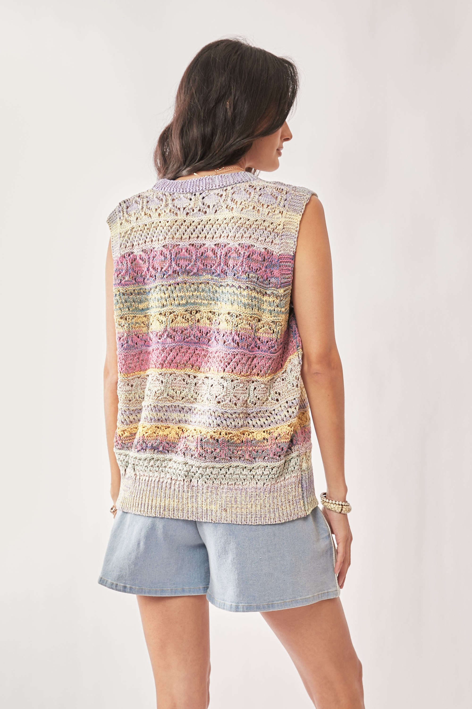 This stunning Davi & Dani sweater vest features a beautiful multicolor pastel stripe pattern in a sophisticated crochet knit design. The sleeveless silhouette is crafted from high-quality yarn with an intricate stitch pattern that creates gorgeous texture throughout. Perfect for both casual and dressy occasions, this versatile piece can be styled multiple ways. The lightweight construction makes it ideal for year-round wear, while the mixed pastel colors add a soft, feminine touch. The relaxed fit and round neckline provide comfort while maintaining a polished appearance. The detailed crochet work showcases exceptional craftsmanship with its delicate openwork pattern.