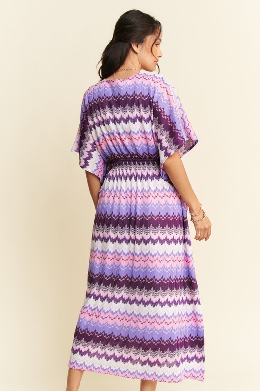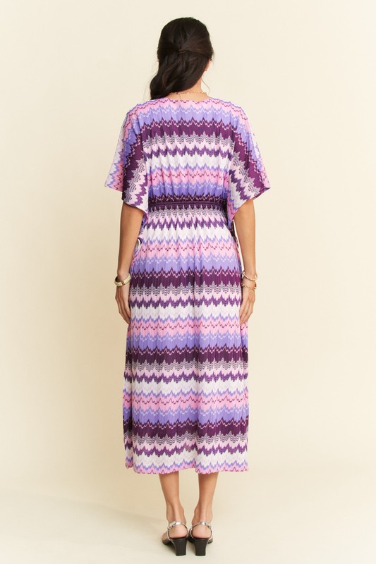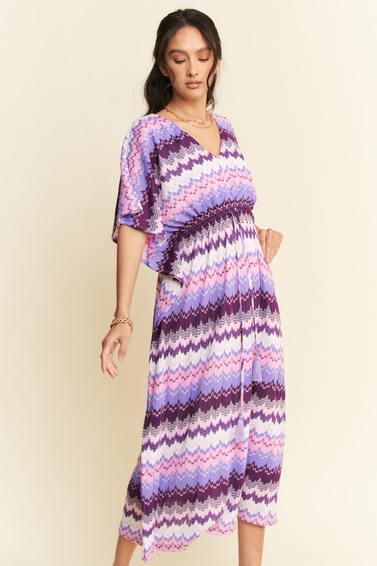 A multi-color wavy tie waist flowy sleeve dress is a vibrant and stylish garment featuring a variety of colors in a wavy pattern. This dress typically includes a tie waist detail to cinch and define the waist, creating a flattering silhouette. The flowy sleeves add a touch of elegance and movement to the dress, making it a versatile choice for both casual and semi-formal occasions. Pair this dress with sandals or heels for a chic and eye-catching look.