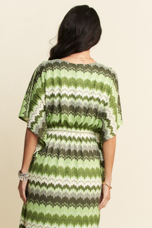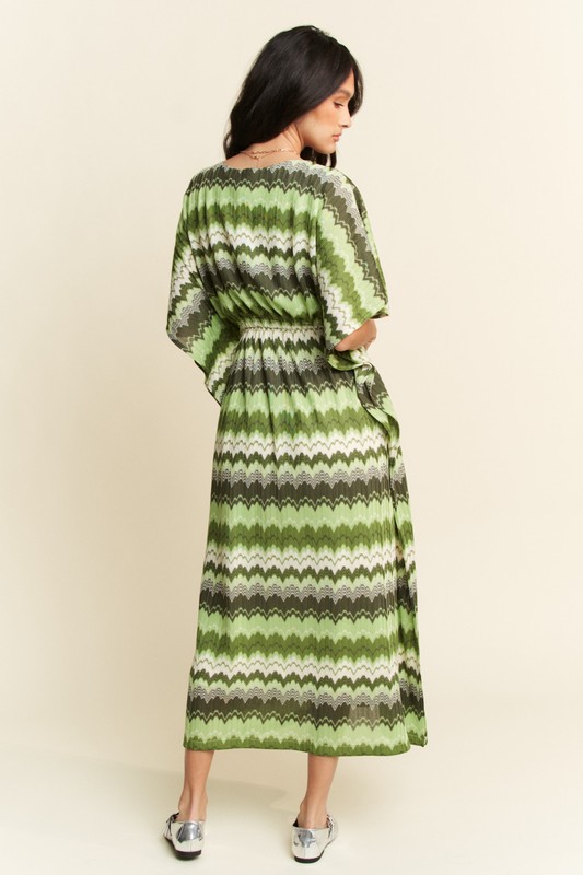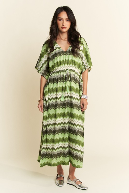 A multi-color wavy tie waist flowy sleeve dress is a vibrant and stylish garment featuring a variety of colors in a wavy pattern. This dress typically includes a tie waist detail to cinch and define the waist, creating a flattering silhouette. The flowy sleeves add a touch of elegance and movement to the dress, making it a versatile choice for both casual and semi-formal occasions. Pair this dress with sandals or heels for a chic and eye-catching look.