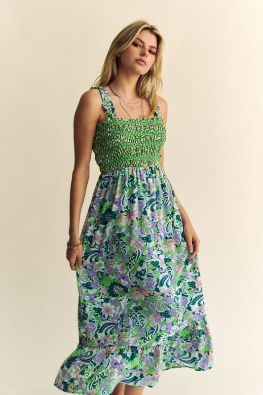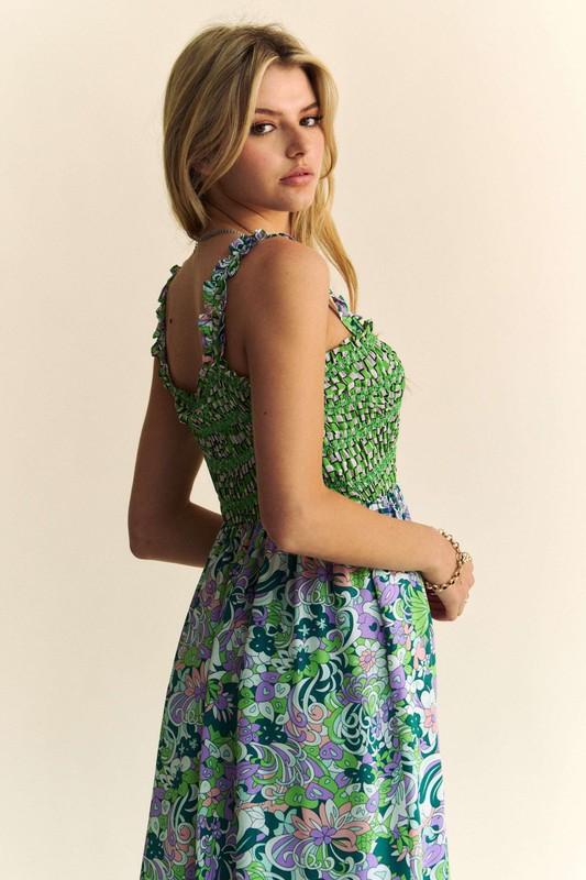The multi-smocked bodice, geo ruffle strappy midi dress is a stylish and feminine piece perfect for various occasions. The smocked bodice offers a form-fitting and flattering silhouette, while the geo ruffle detailing adds a playful and trendy element to the dress. The midi length is elegant and versatile, making it suitable for both casual and dressier events. The strappy design adds a touch of sophistication and a summery vibe to the dress. This dress can be styled with sandals or heels for a chic and on-trend look. Overall, the multi-smocked bodice, geo ruffle strappy midi dress is a fashionable option that allows you to make a statement with your outfit.