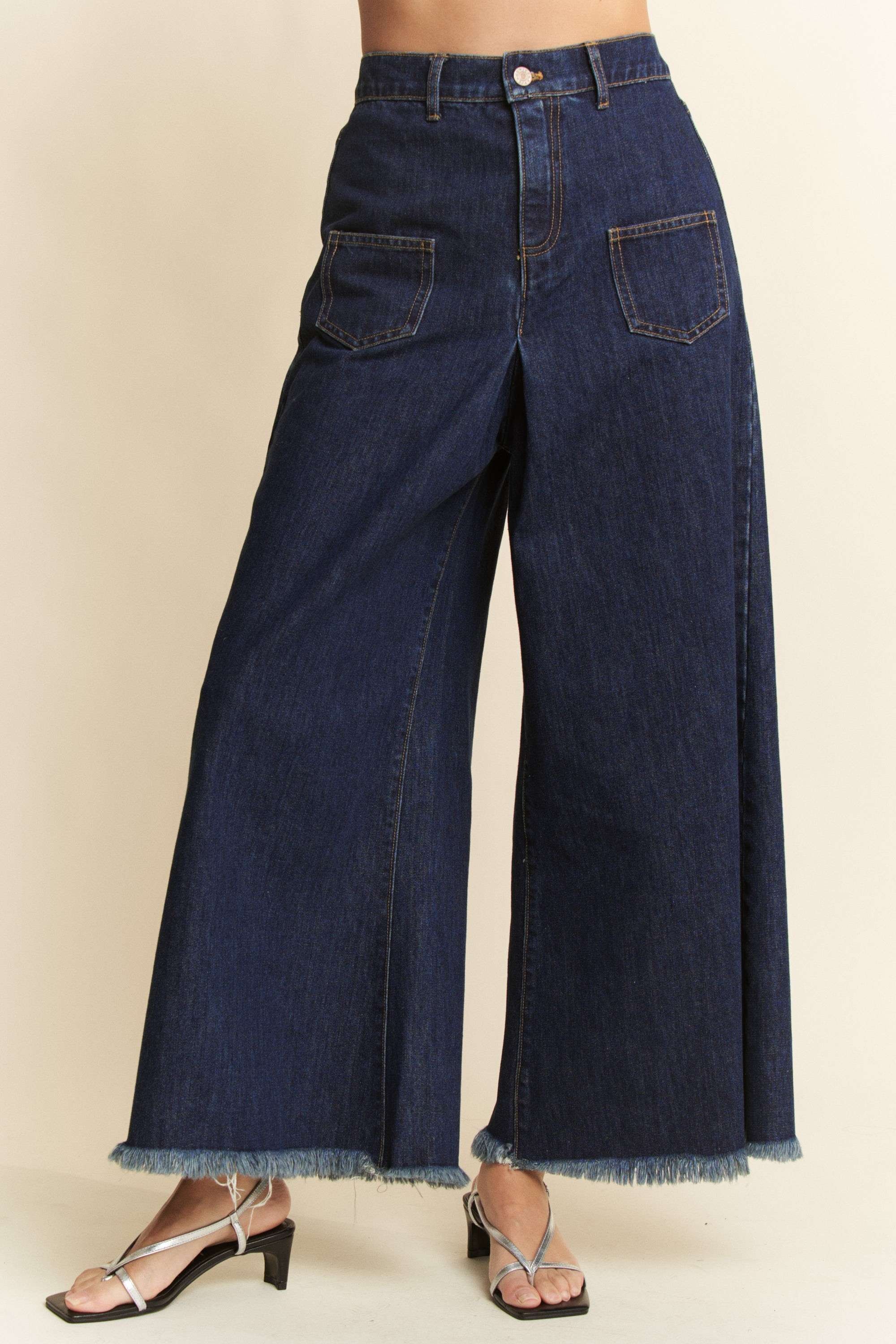 These premium wide-leg culottes showcase contemporary denim styling with a high-rise waist and dramatic wide-leg silhouette. Crafted from quality denim in a versatile dark wash, these jeans feature practical front patch pockets and a distinctive raw hem detail. The cropped length and relaxed fit create a modern, fashion-forward look that's both comfortable and stylish. Perfect for casual wear while maintaining a polished appearance.