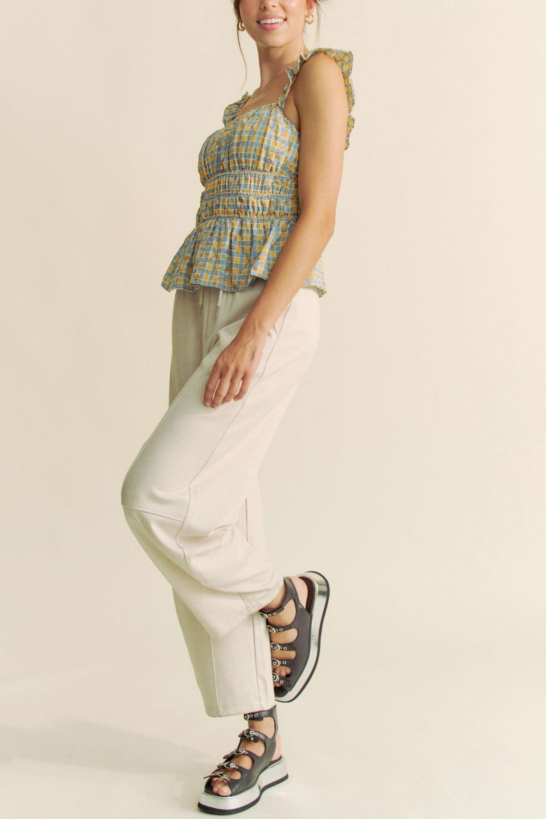 This Plaid Ruffled Strap Smocked Sleeveless Top combines classic plaid with trendy details for a stylish look. The ruffled straps add a touch of femininity, while the smocked bodice provides a flattering and comfortable fit. Perfect for a casual yet chic ensemble, this sleeveless top is a versatile piece that can be dressed up or down for different occasions.