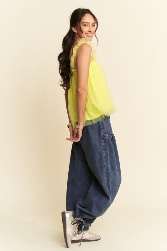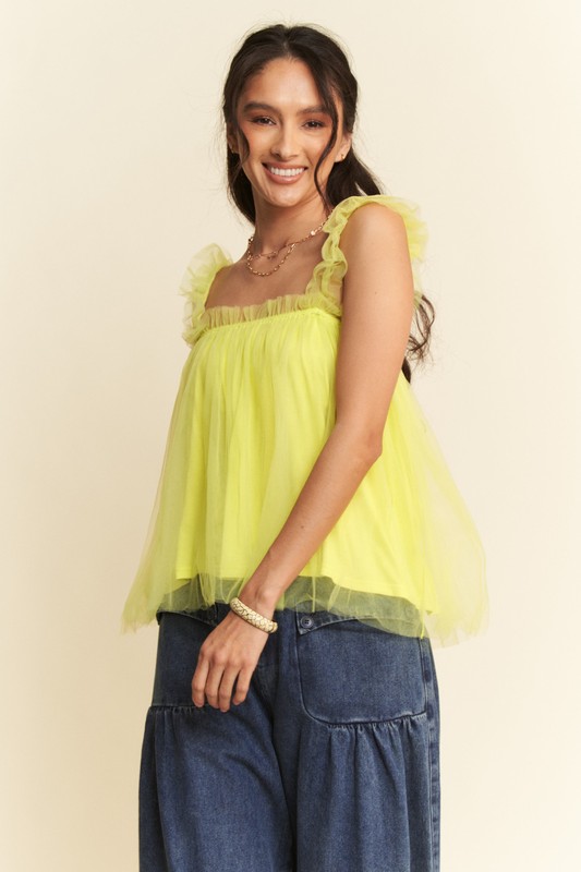 A shirred ruffle strap tulle babydoll top is a lovely and feminine piece that combines gentle detailing for a romantic flair. This top includes shirred accents, ruffled straps, and light tulle fabric in a darling babydoll shape. Ideal for a charming and playful ensemble, this top pairs beautifully with jeans or a skirt to create a whimsical and graceful look.