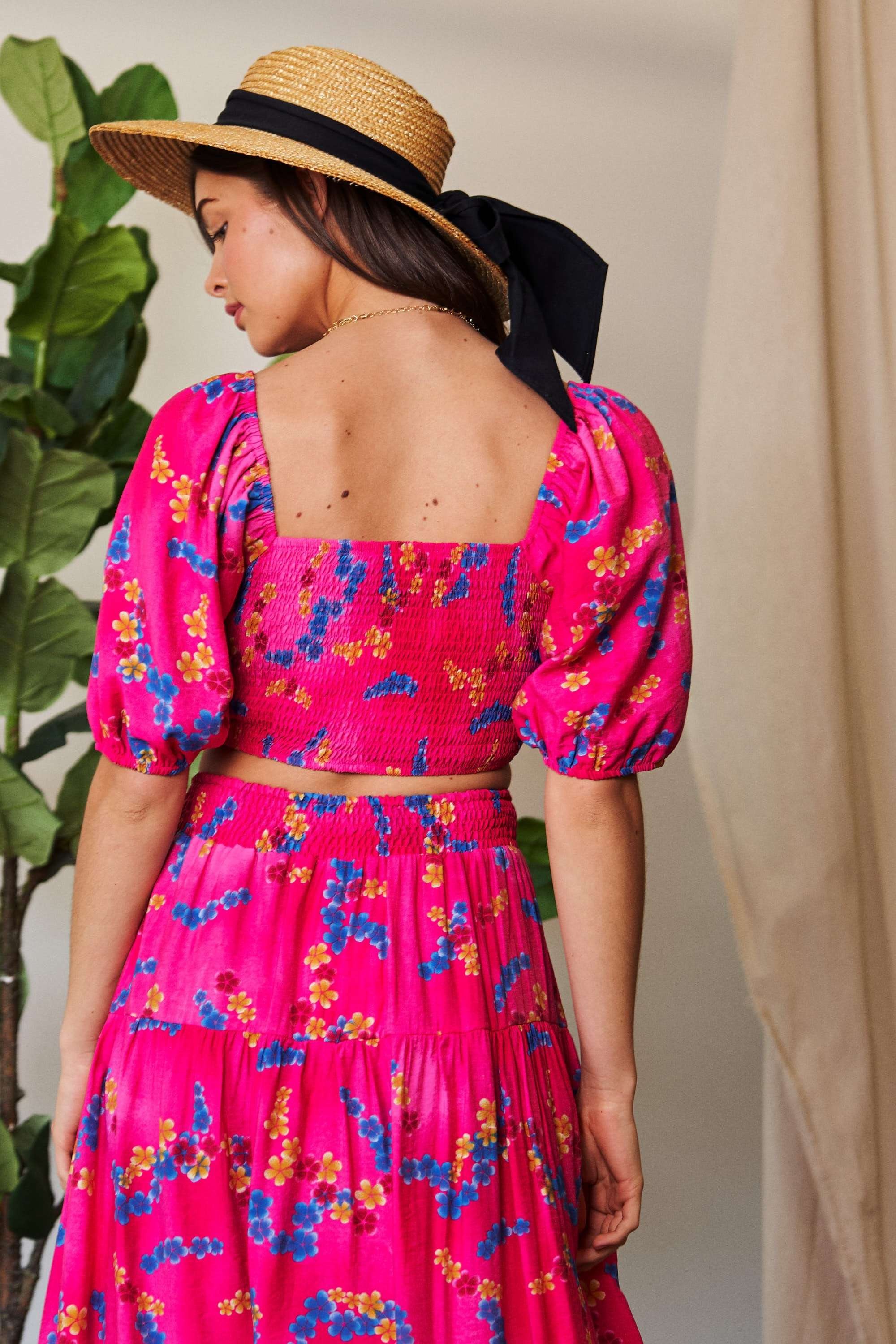 This stunning crop top features a fashion smocked bodice design with romantic puff sleeves. Made from a lightweight, stretchy fabric with a vibrant hot pink base adorned with blue and yellow floral prints. The square neckline and cropped length create a flattering silhouette. Perfect for summer occasions, beach outings, or casual wear. The elastic smocking provides comfortable fit and easy wear. Can be paired with matching skirt for a coordinated set or styled with high-waisted bottoms.