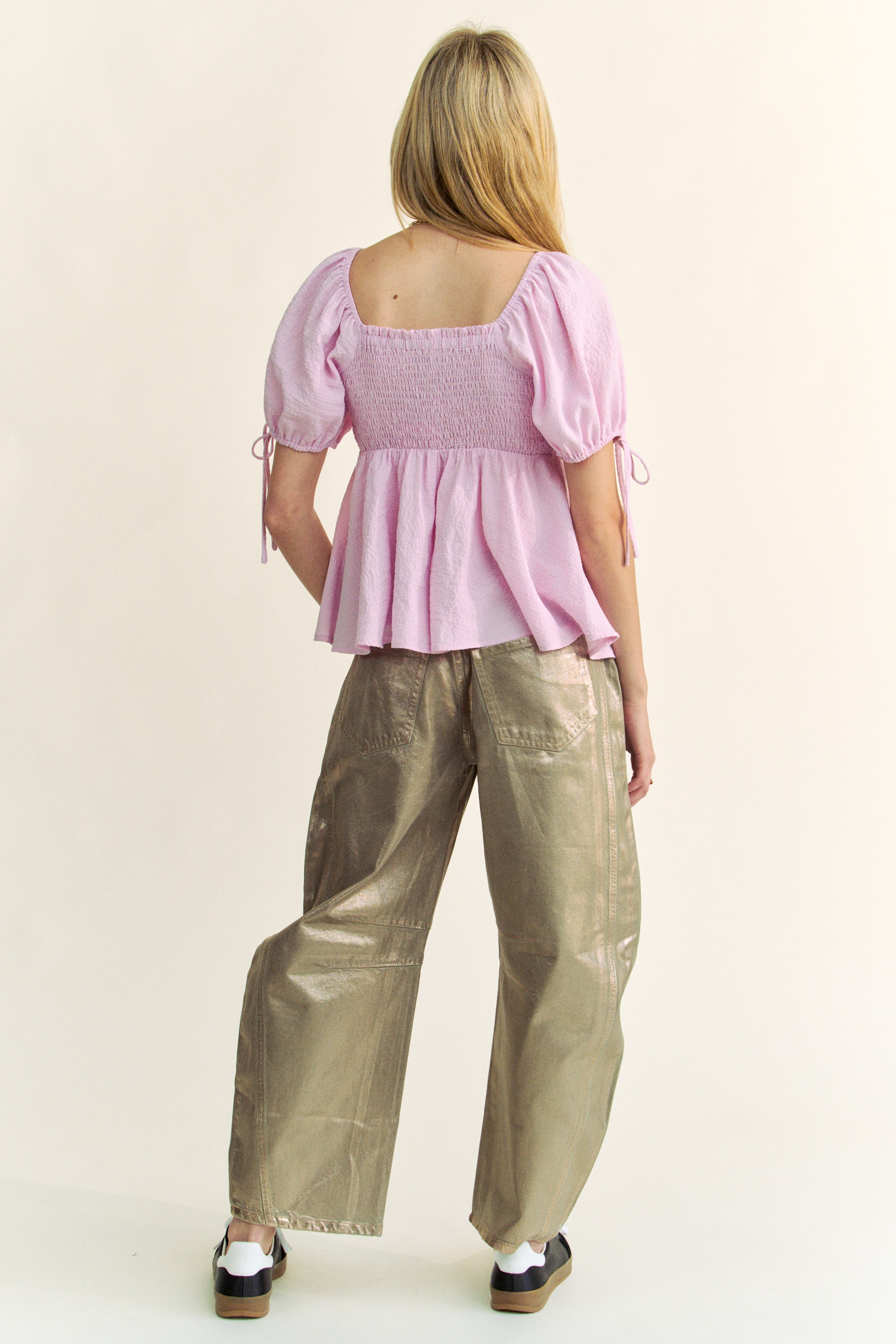 The Solid Elastic Peplum Puffed Sleeves Blouse Top is a versatile and elegant option for various occasions. With a flattering peplum silhouette and stylish puffed sleeves, this blouse exudes a feminine charm. The elastic waist creates a defined shape, making it easy to pair with skirts or pants. Whether for a work meeting or a night out, this top adds a touch of sophistication to your outfit.