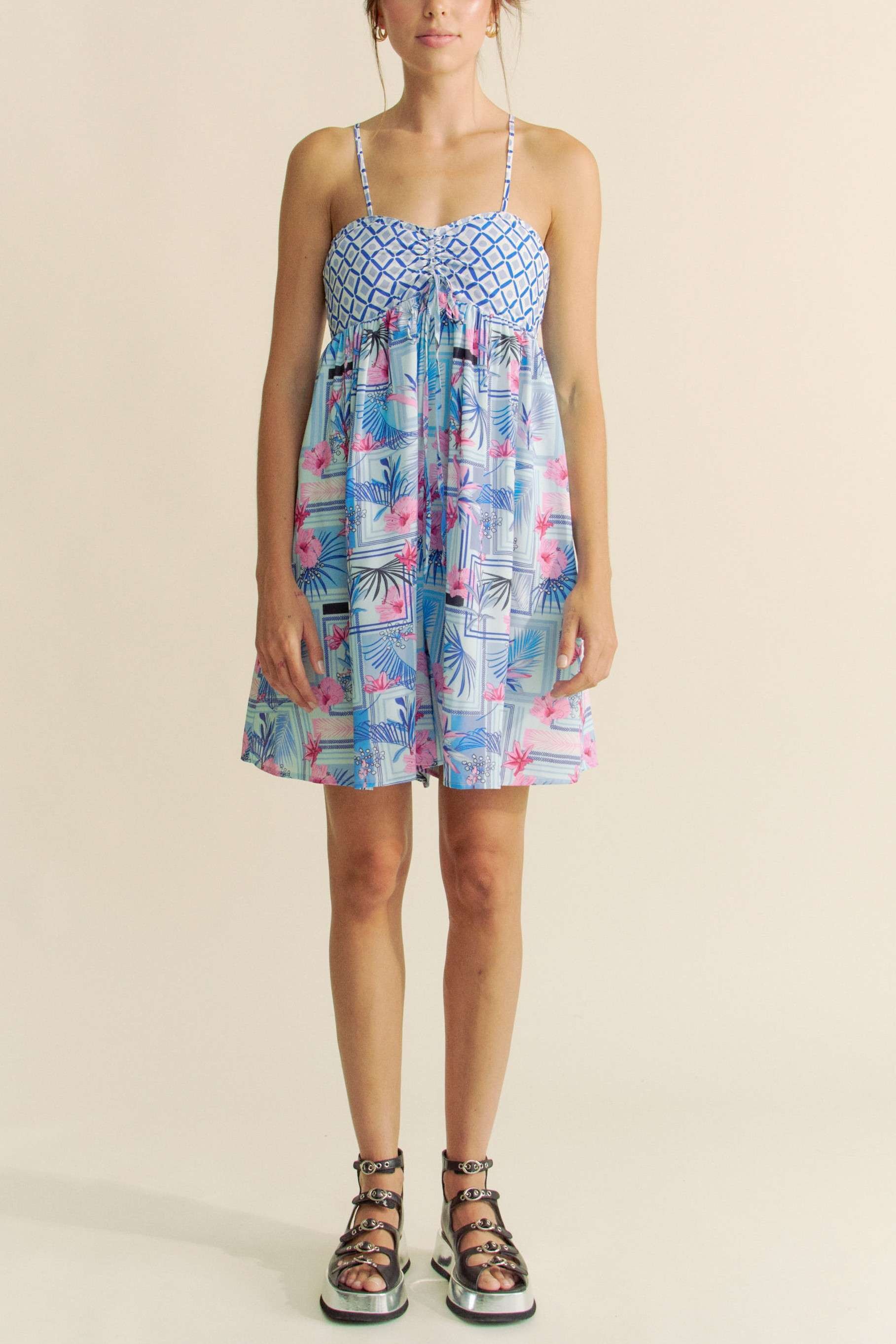 This charming summer romper features a delightful combination of geometric and tropical prints. The bodice showcases a blue and white geometric pattern, while the skirt portion displays a dreamy tropical scene with palm leaves and pink florals against a light blue background. Made from soft, breathable fabric perfect for warm weather, this piece offers both style and comfort. The empire waist design creates a flattering silhouette, while the adjustable spaghetti straps ensure a perfect fit. Ideal for beach vacations, resort wear, or casual summer outings.