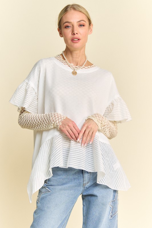 The waffle knit bodice ruffle bottom detail top features a textured waffle knit fabric on the bodice and ruffle detailing at the bottom hem. This top combines comfort and style with its unique texture and feminine design. The ruffle detailing adds a playful and flattering touch to the overall look, making it a charming option for casual or dressed-up outfits.
