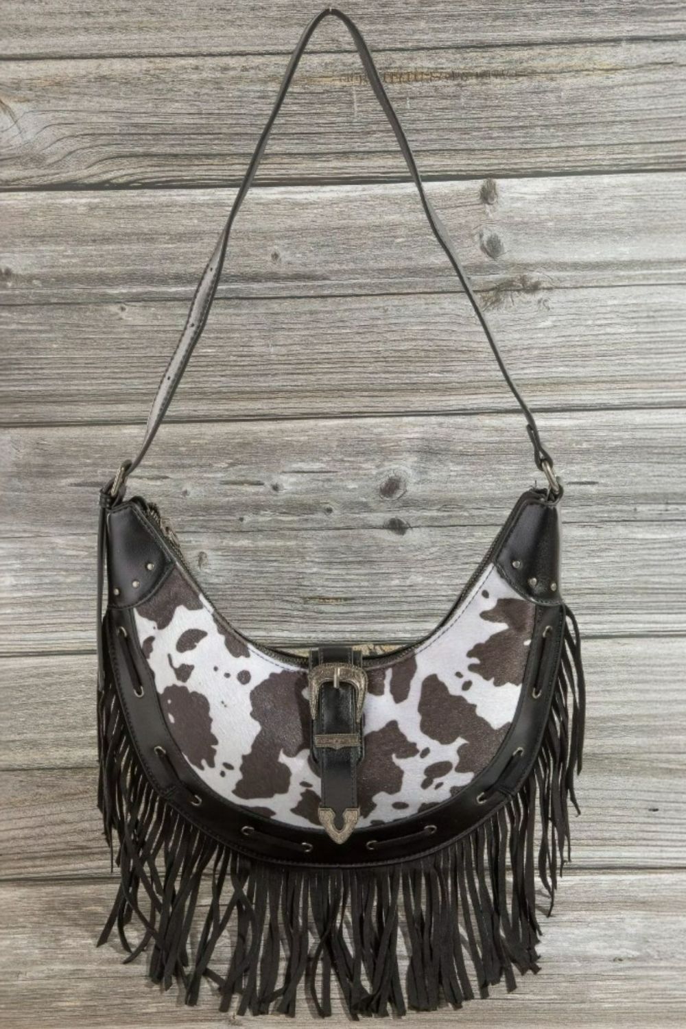 This striking Western-inspired hobo handbag features an eye-catching brown and white cowhide print pattern with luxurious black leather fringe detailing. The spacious crescent-shaped silhouette offers ample storage while maintaining a stylish bohemian aesthetic. Crafted with durable fabric material and genuine leather accents, this bag includes an adjustable shoulder strap for comfortable wear and a distinctive metal buckle centerpiece that adds authentic Western charm. The cascading fringe creates beautiful movement and texture, making this handbag perfect for festival wear, casual outings, or adding a bold statement to any outfit. The versatile design combines rustic ranch-style elements with modern functionality.