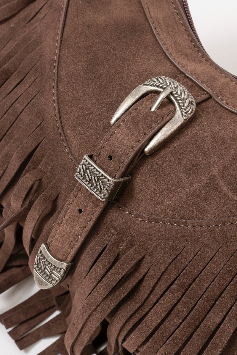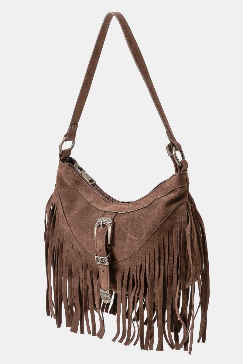 Add a touch of bohemian flair to your outfit with this Faux Suede Cascade Fringe Shoulder Bag. The faux suede material gives this bag a luxurious and stylish look. The cascade fringe detail adds a fun and playful element to the design. This shoulder bag is perfect for carrying your essentials while making a fashion statement. Pair it with your favorite boho-inspired outfits for a chic and trendy look that will elevate your style.