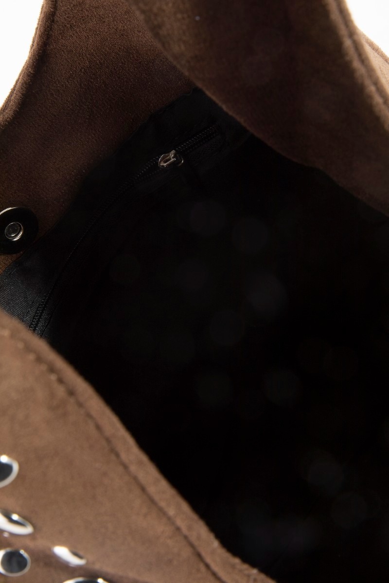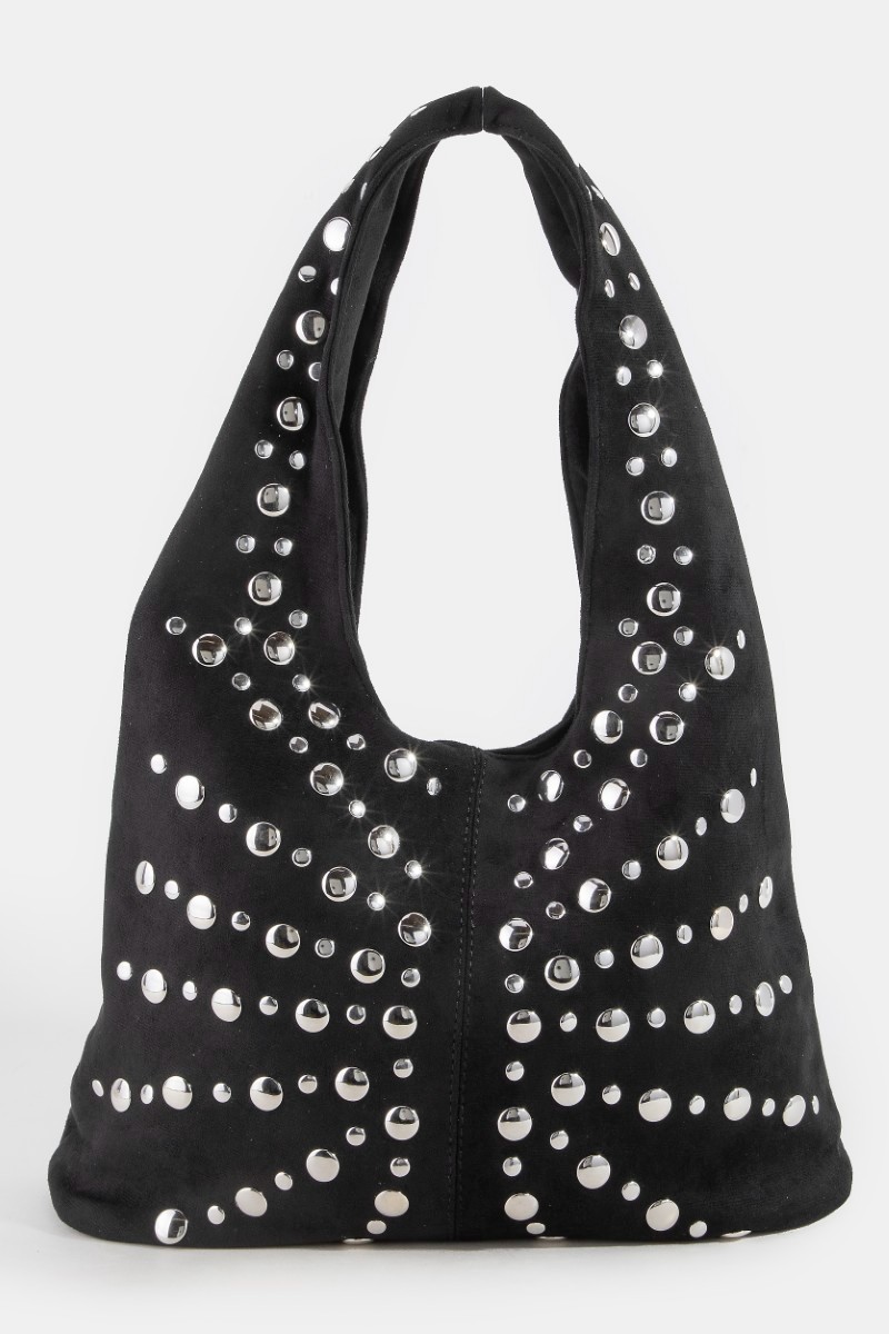 The Grommet Studded Suede Shoulder Bag is a fashion-forward accessory that adds a touch of edgy sophistication to your look. Featuring grommet and studded detailing, this shoulder bag offers a trendy and modern vibe. Crafted from suede material, it exudes a luxurious and textured appeal. The shoulder bag design provides practicality and style, making it a versatile piece for various occasions. Elevate your outfit with this stylish and statement-making shoulder bag that effortlessly combines fashion and functionality.