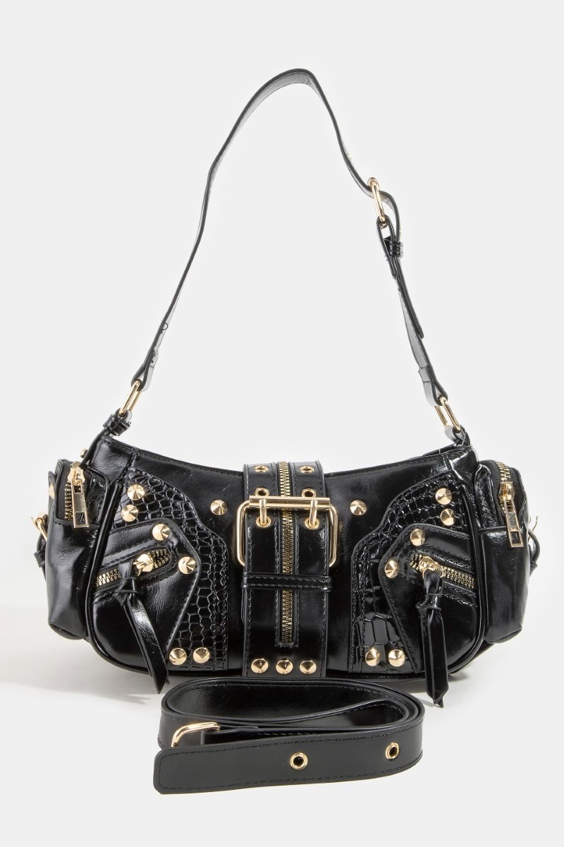 A rivet detail leather shoulder bag is a sleek and stylish accessory that exudes a sophisticated appeal. The rivet detailing adds a touch of edginess and modernity to the classic leather construction, creating a versatile piece that can elevate any outfit. With its shoulder strap, this bag offers practicality and ease of wear, making it perfect for everyday use. The high-quality leather material ensures durability and a luxurious look. Whether for a casual day out or a more formal event, this rivet detail leather shoulder bag is a chic and timeless option to add to your accessory collection.