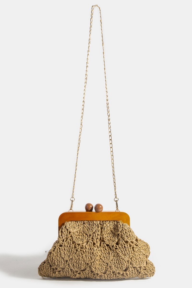 A straw braided wooden frame clutch bag is a stylish and unique accessory that combines natural textures with a touch of sophistication. The straw braided exterior adds a chic and summery vibe to the bag, while the wooden frame provides structure and durability. This clutch bag is perfect for adding a bohemian touch to your outfit and is ideal for both casual and more dressed-up occasions. With its compact size and sleek design, it can hold your essentials securely while keeping you stylish. Elevate your look with this trendy and versatile straw braided wooden frame clutch bag.