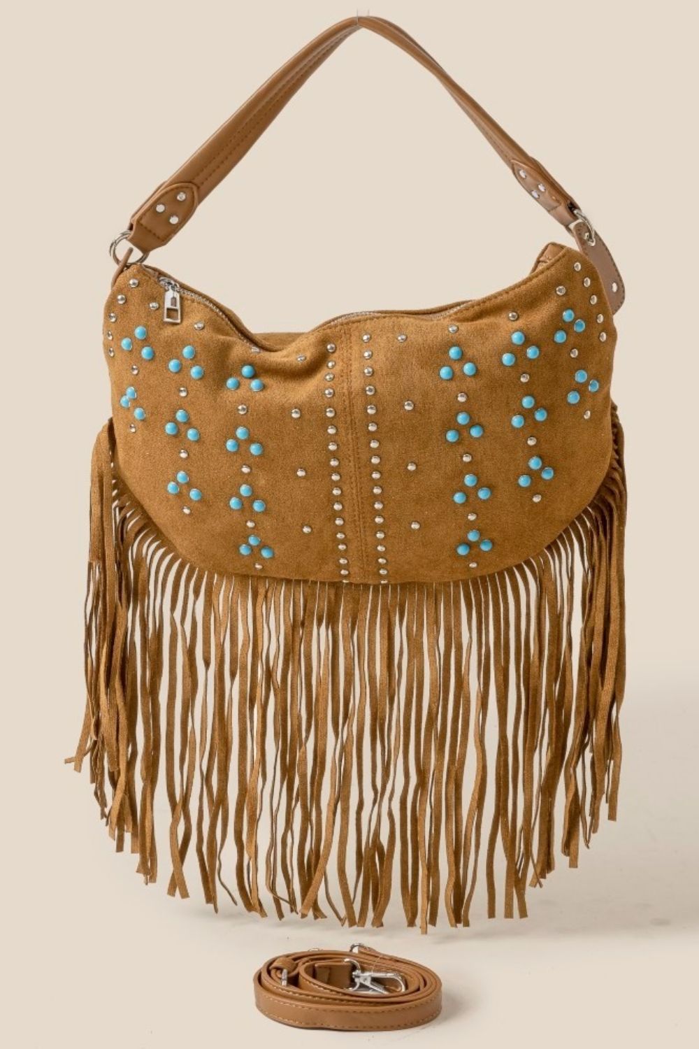 This stunning bohemian shoulder bag features premium brown leather construction with distinctive fringe detailing that creates beautiful movement and texture. The bag showcases an array of turquoise and silver studs arranged in decorative patterns, adding a Western-inspired flair. The spacious hobo-style silhouette provides ample storage while maintaining an elegant curved shape. Crafted from soft, supple leather with meticulous stitching details, this versatile piece includes an adjustable strap for comfortable shoulder or crossbody wear. The rich cognac brown leather pairs beautifully with the metallic accents, making it perfect for both casual and dressy occasions.