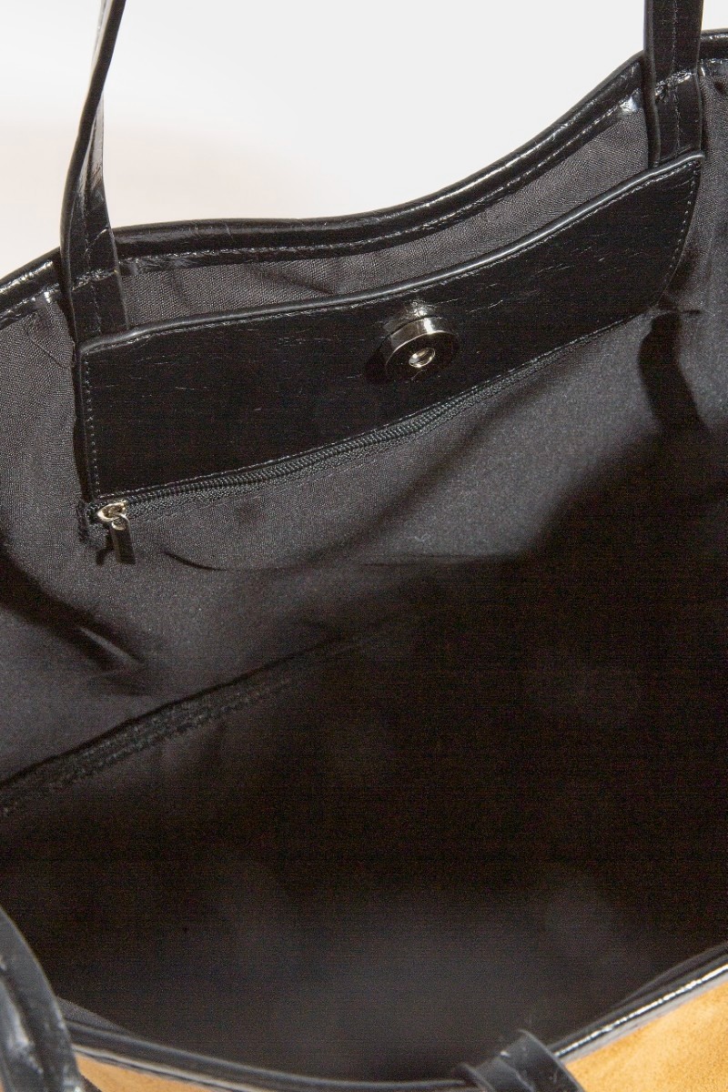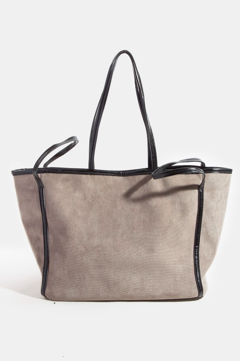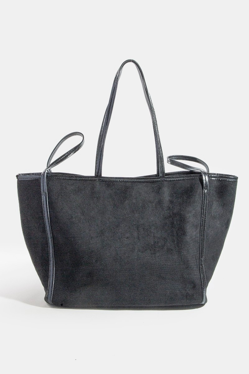 This fashionable suede tote with faux leather trim and shoulder strap is a versatile accessory that combines style and functionality. The luxurious suede material adds a touch of sophistication, while the faux leather trim adds a chic contrast. The shoulder strap offers comfort for carrying your essentials on the go, making it a practical choice. Perfect for everyday use or special occasions, this tote is a stylish and convenient accessory option. Elevate your outfit with this sleek and trendy suede tote that exudes both elegance and practicality.