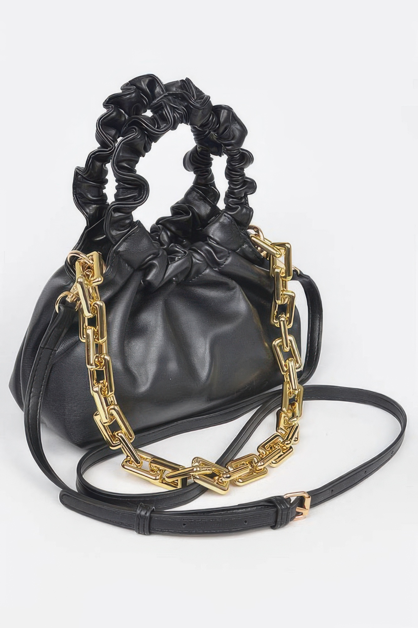 Faux Leather Pleated Chain Bag blends classic structure with textured detail in a versatile, mid-sized silhouette. Crafted from soft polyurethane with pleated folds and finished with mixed metal hardware, this piece delivers elevated everyday style. It measures approximately 8 x 5.5 x 4 inches, offering space for your essentials without bulk. The chain strap adds a chic contrast and can be styled as a crossbody or shoulder bag. Its pleated body gives a soft, dynamic look while keeping a firm shape. Lightweight yet durable, it's perfect for transitioning from day to evening. A stylish choice for polished yet effortless dressing.