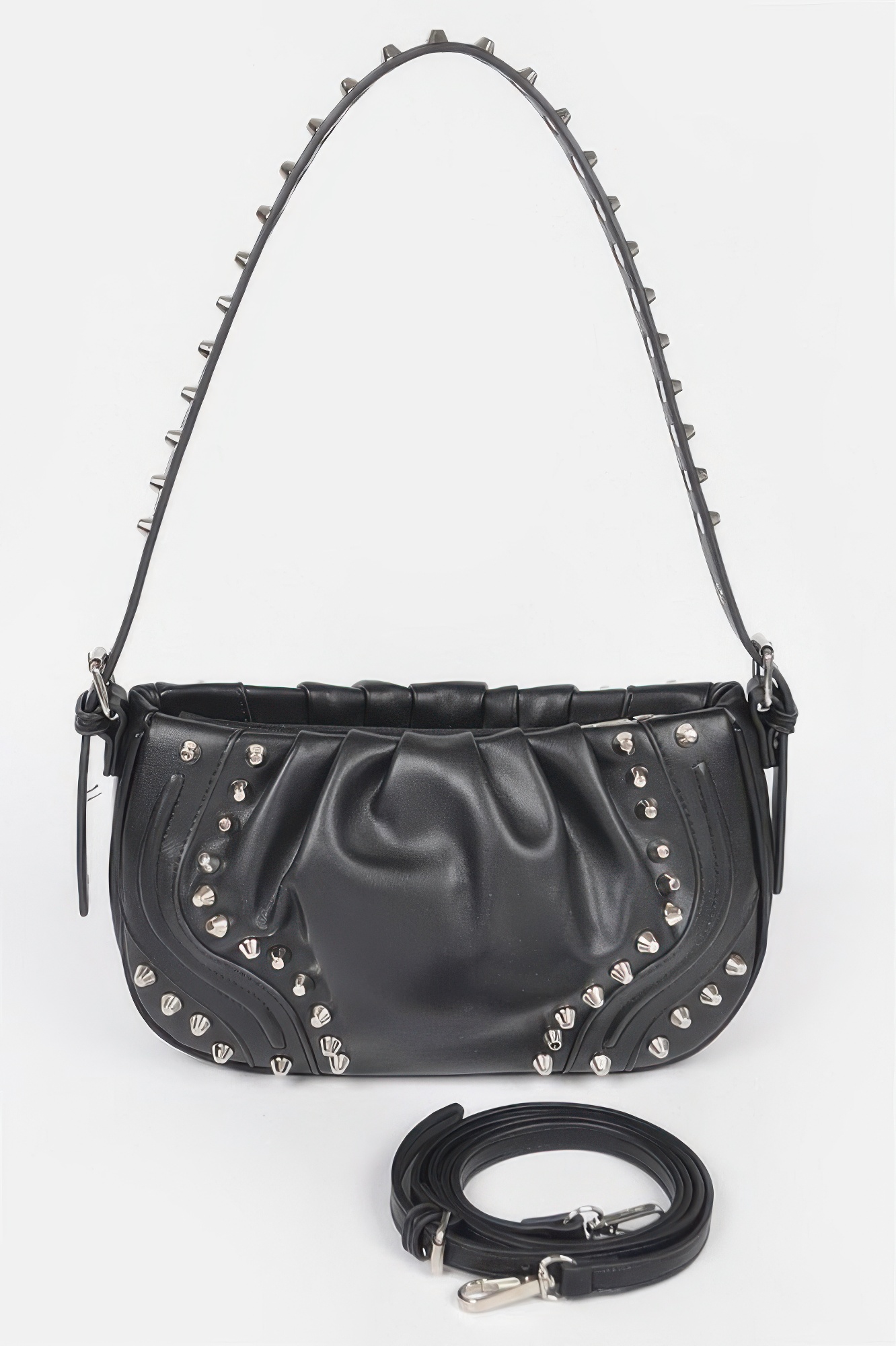 This faux leather stud shoulder bag delivers edgy detail with everyday functionality. Designed with a structured silhouette, it features stud accents that add bold character. The shoulder strap offers comfortable wear while maintaining a polished look. Compact yet practical, it fits daily essentials with ease. A versatile bag with modern edge.