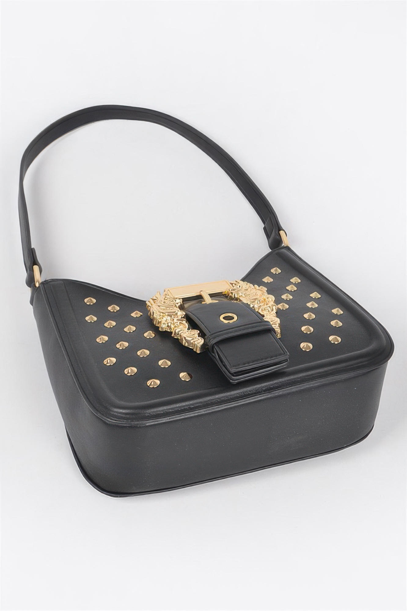 Bold and structured, the Faux Leather Studded Metal Buckle Shoulder Bag brings edge and elegance together. Featuring studded accents and a sleek buckle closure, this shoulder bag is ideal for those who favor standout style. The roomy interior and sturdy construction make it a functional and fashionable everyday option. Pair it with denim or dresses for instant polish.