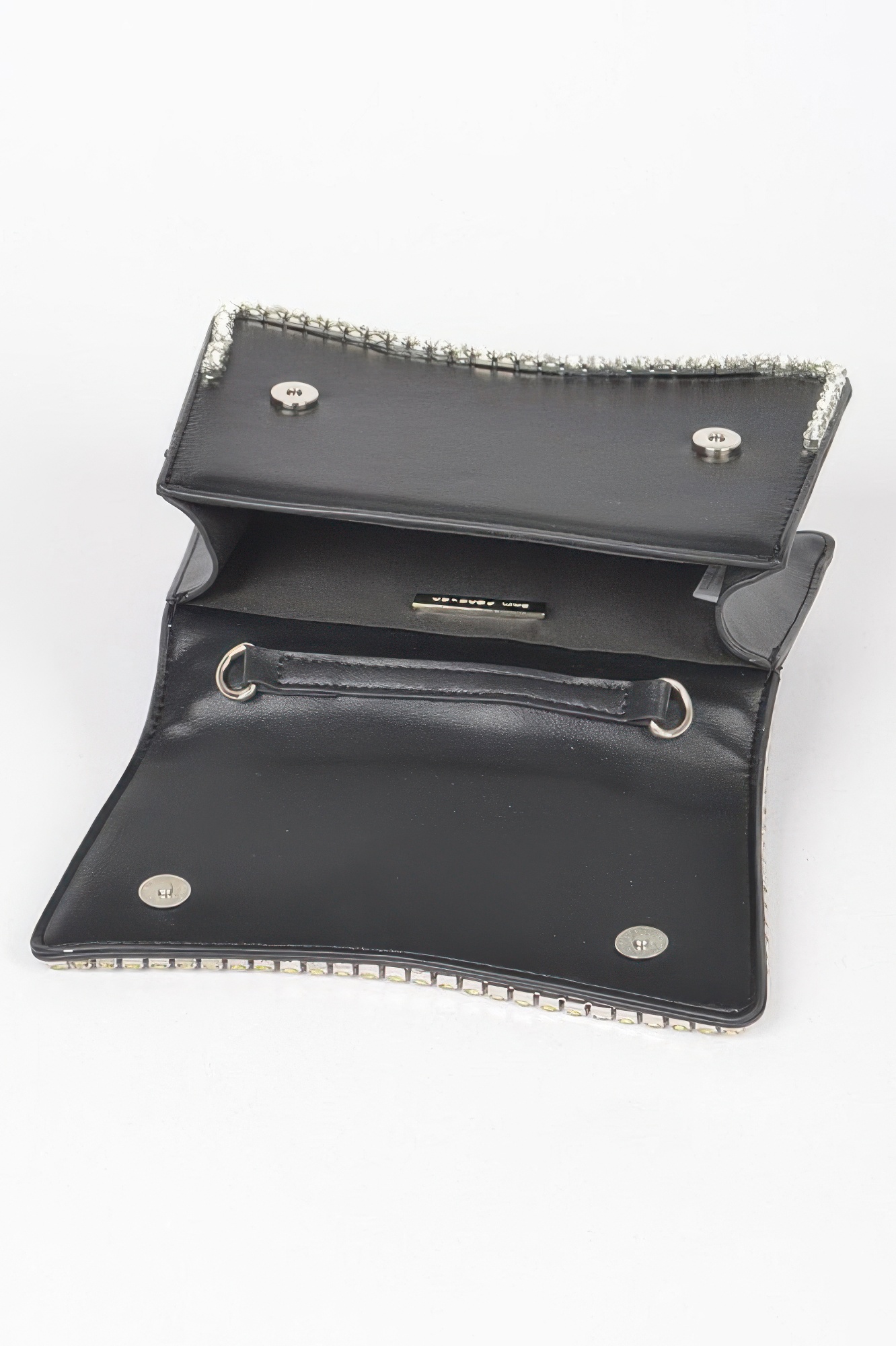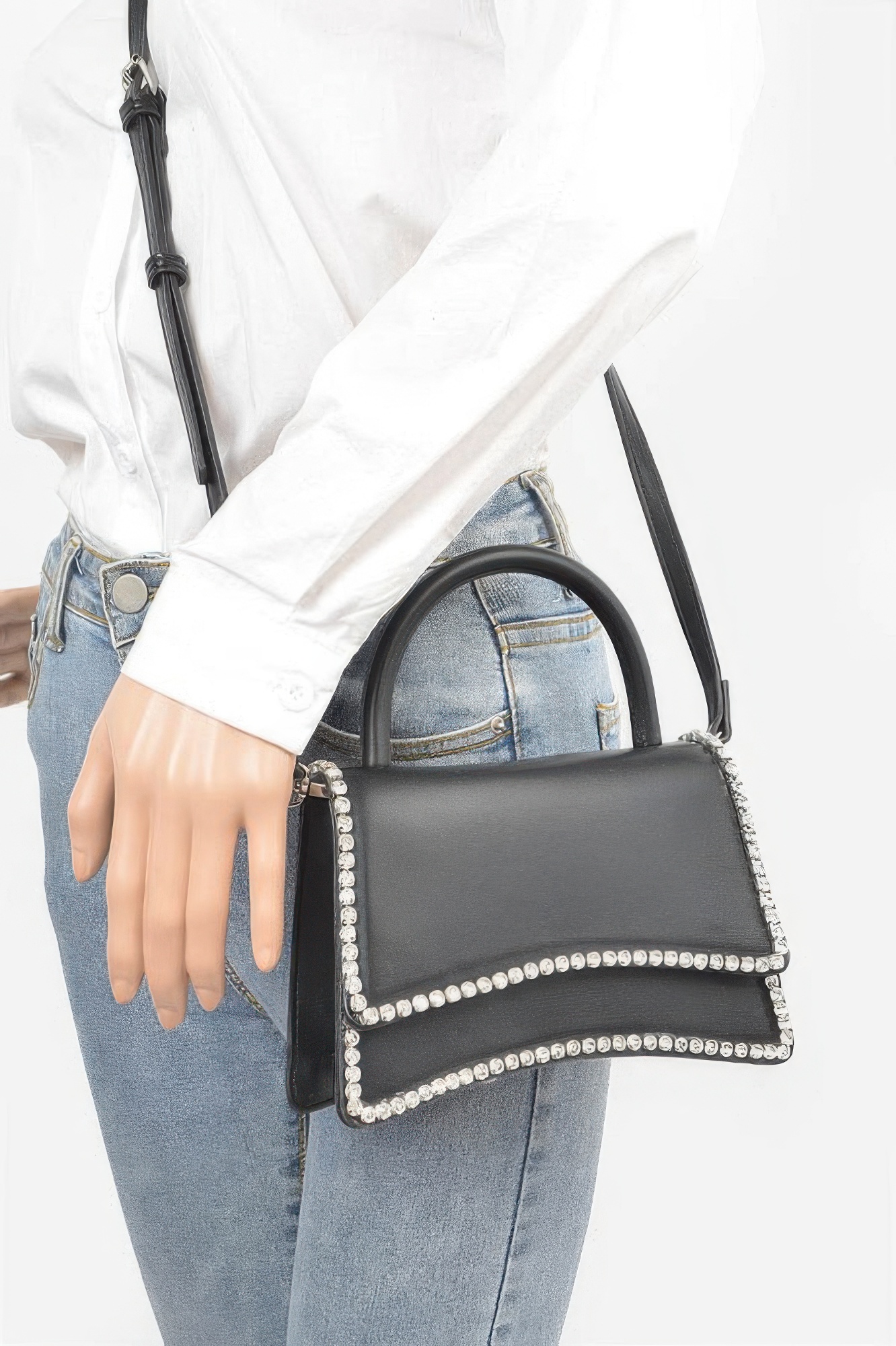 This faux leather top handle flap bag delivers timeless structure with a touch of sparkle. Designed with a refined silhouette, it features rhinestone detailing that adds subtle elegance. The structured body maintains its shape while offering practical storage for essentials. Finished with mixed metal accents, it transitions seamlessly from daytime events to evening occasions. A polished accessory that enhances any look.
