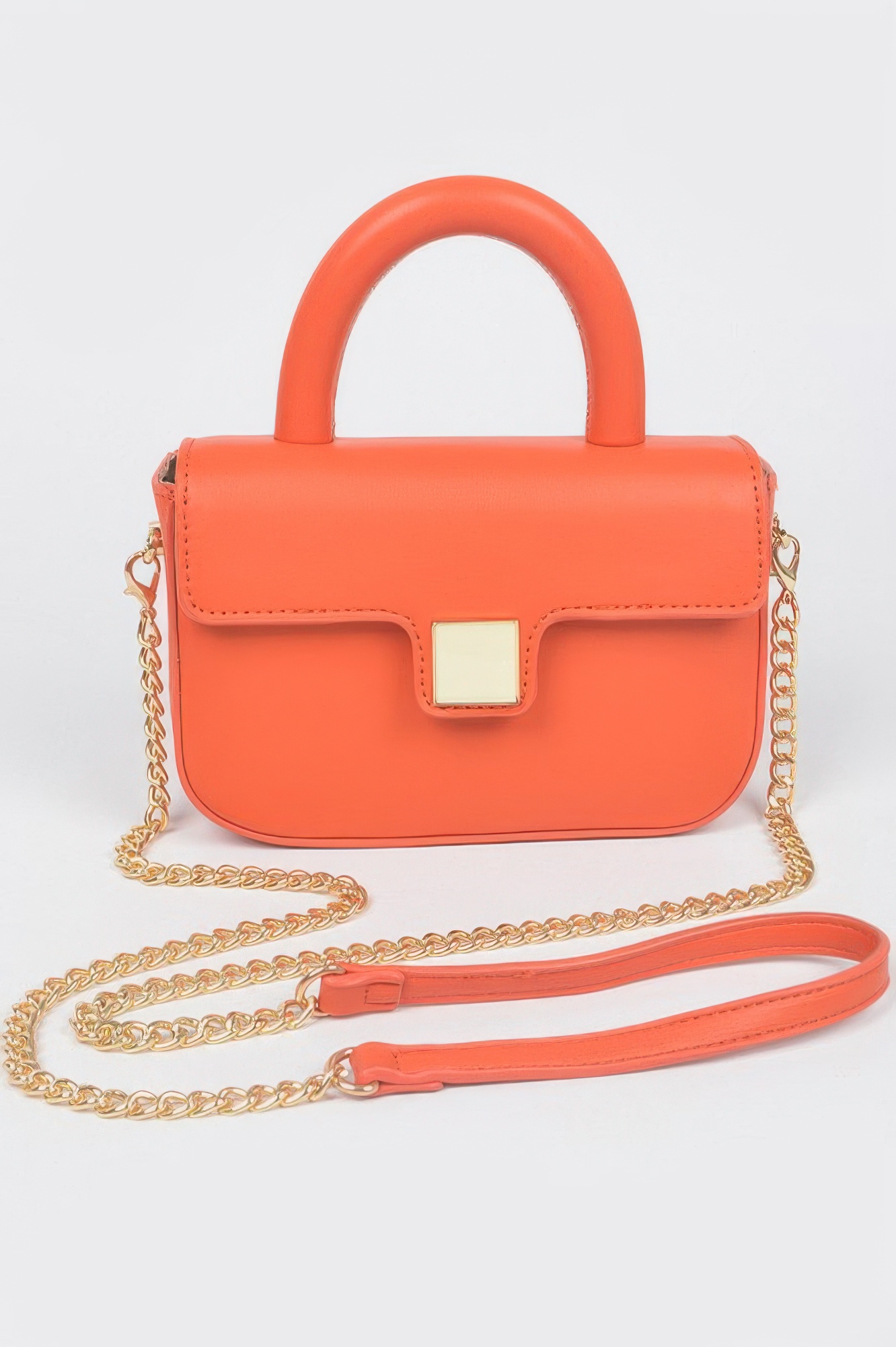 This faux leather top handle flap crossbody bag features a structured silhouette with a classic flap closure for a clean and polished look. The combination of top handle and crossbody strap offers versatile styling options. Its compact size makes it ideal for carrying essentials with ease. The smooth finish enhances its refined appearance. A versatile accessory, it transitions effortlessly from day to night.