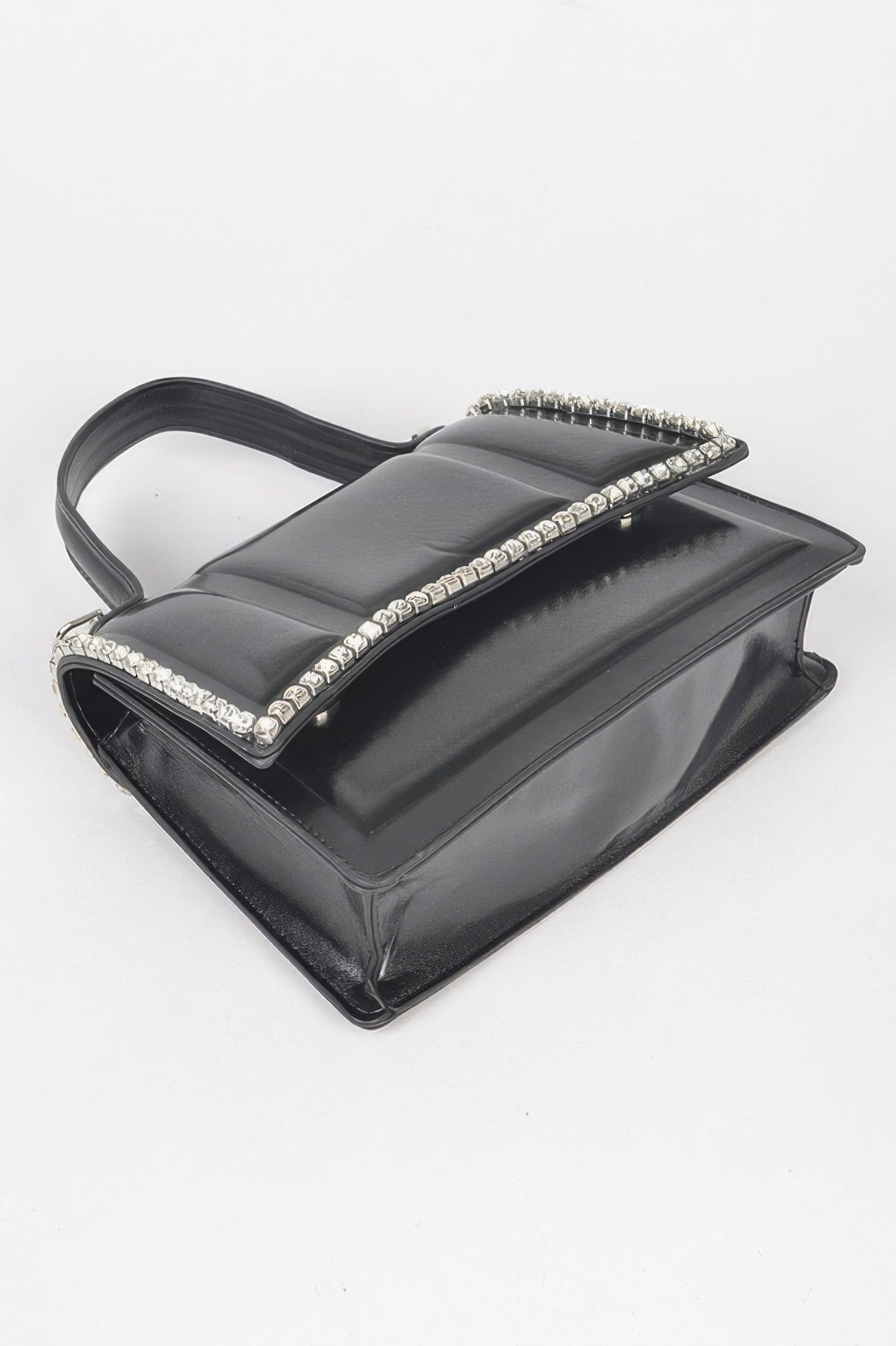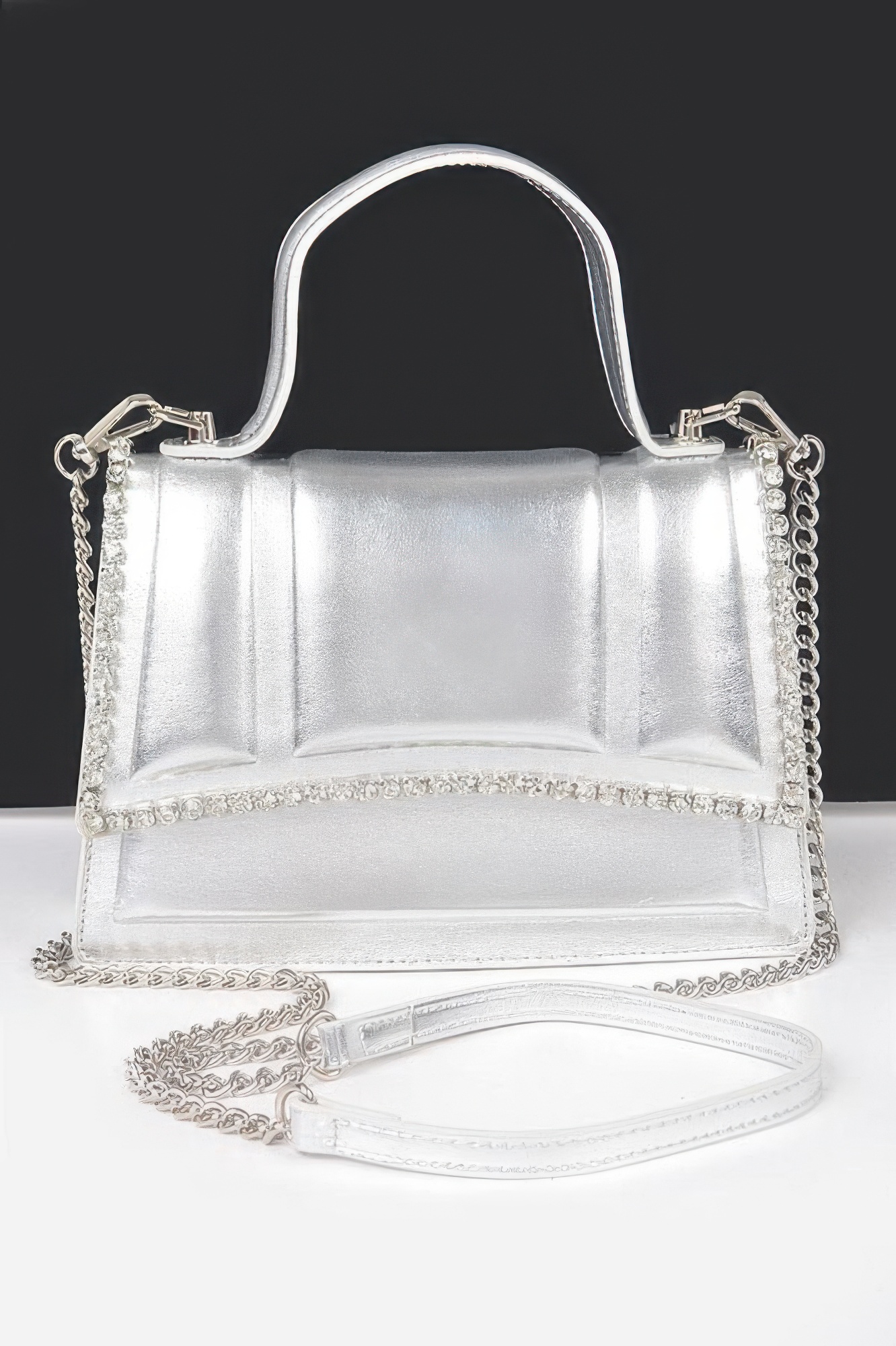 This faux metallic leather top handle bag delivers a sleek and luminous finish. Designed with stone embellishments, it adds subtle sparkle to a structured silhouette. The compact shape keeps essentials organized while maintaining a refined look. A sturdy top handle offers comfortable carry and timeless appeal. The metallic exterior enhances both daytime and evening outfits. Durable materials ensure lasting quality and structure. This bag is a polished accessory designed for elevated styling.