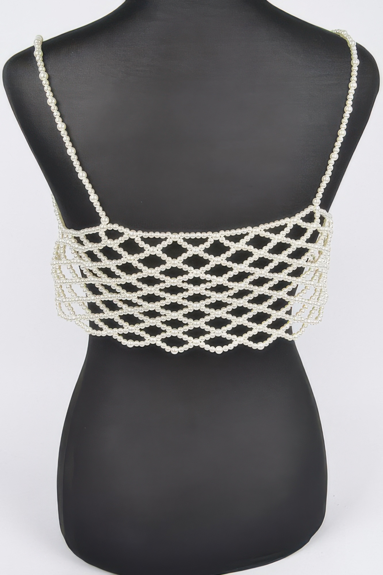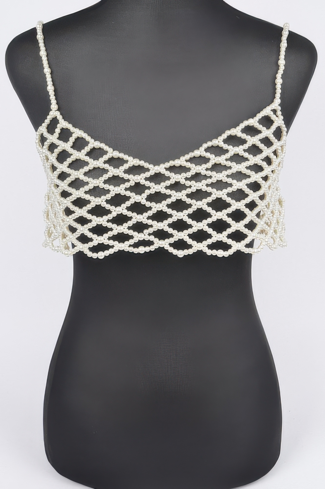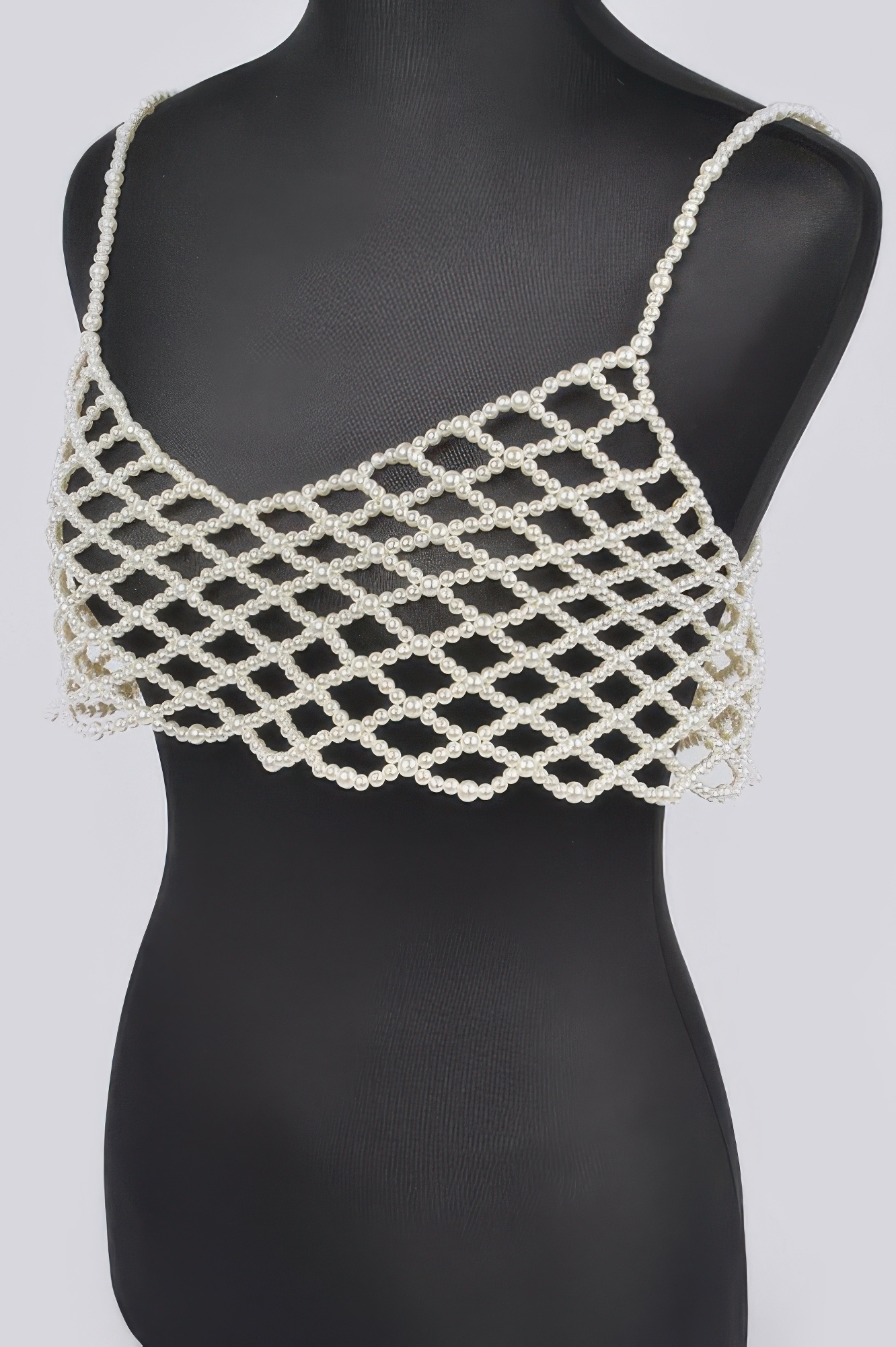 The Faux Pearl Bralette offers a bold and glamorous take on statement layering. Designed with elegant pearl accents arranged across a structured bralette silhouette, this piece adds striking texture and shine to any outfit. The decorative design creates a standout look that pairs beautifully with blazers, sheer tops, or evening ensembles. Lightweight yet eye-catching, it brings a fashion-forward element to your wardrobe. Whether styled for special events or elevated night-out looks, it delivers a distinctive finish. This bralette transforms classic pearl detailing into a modern statement accessory.