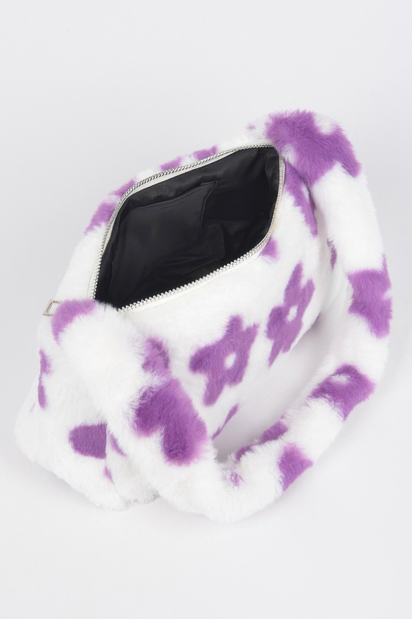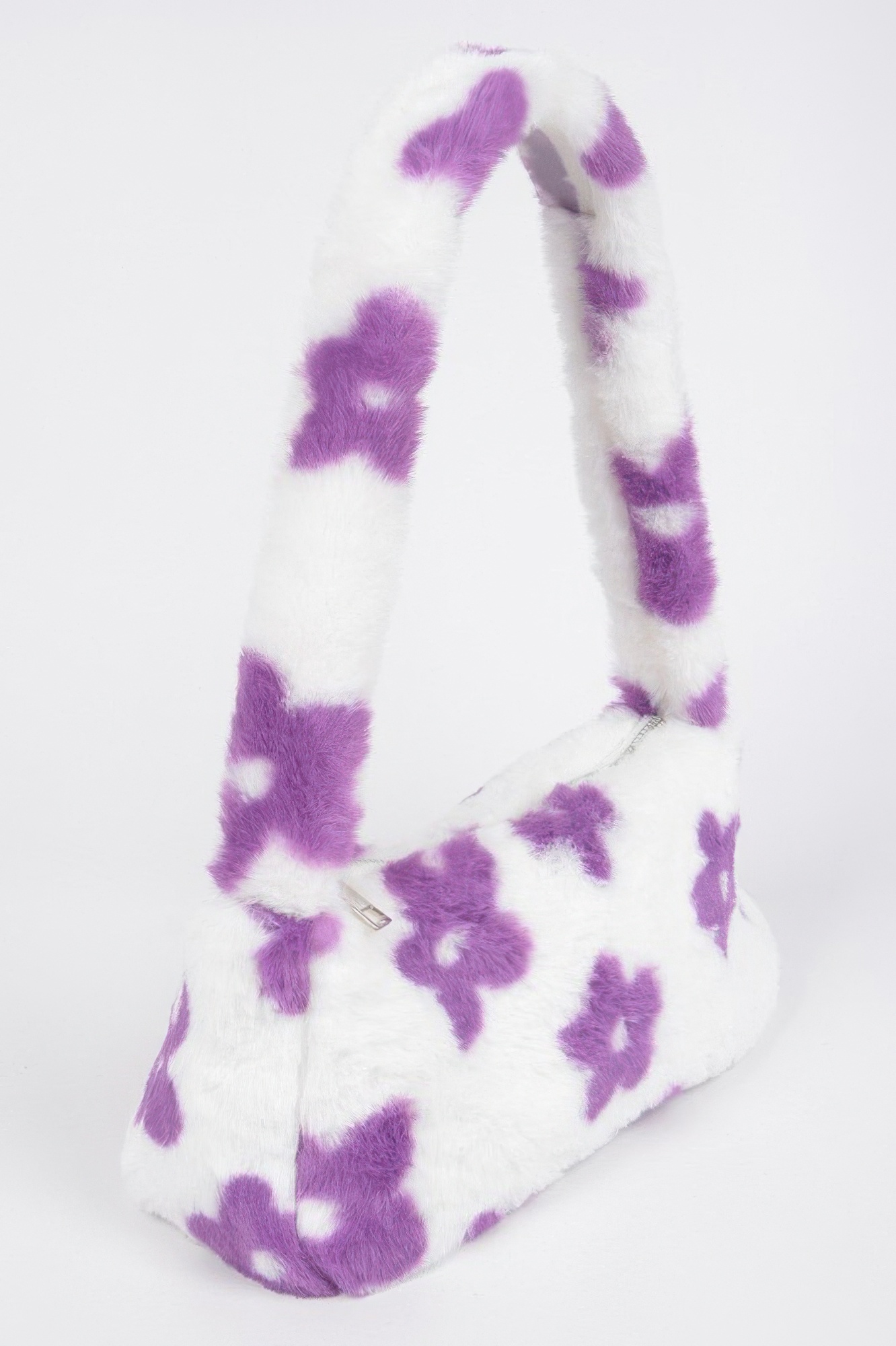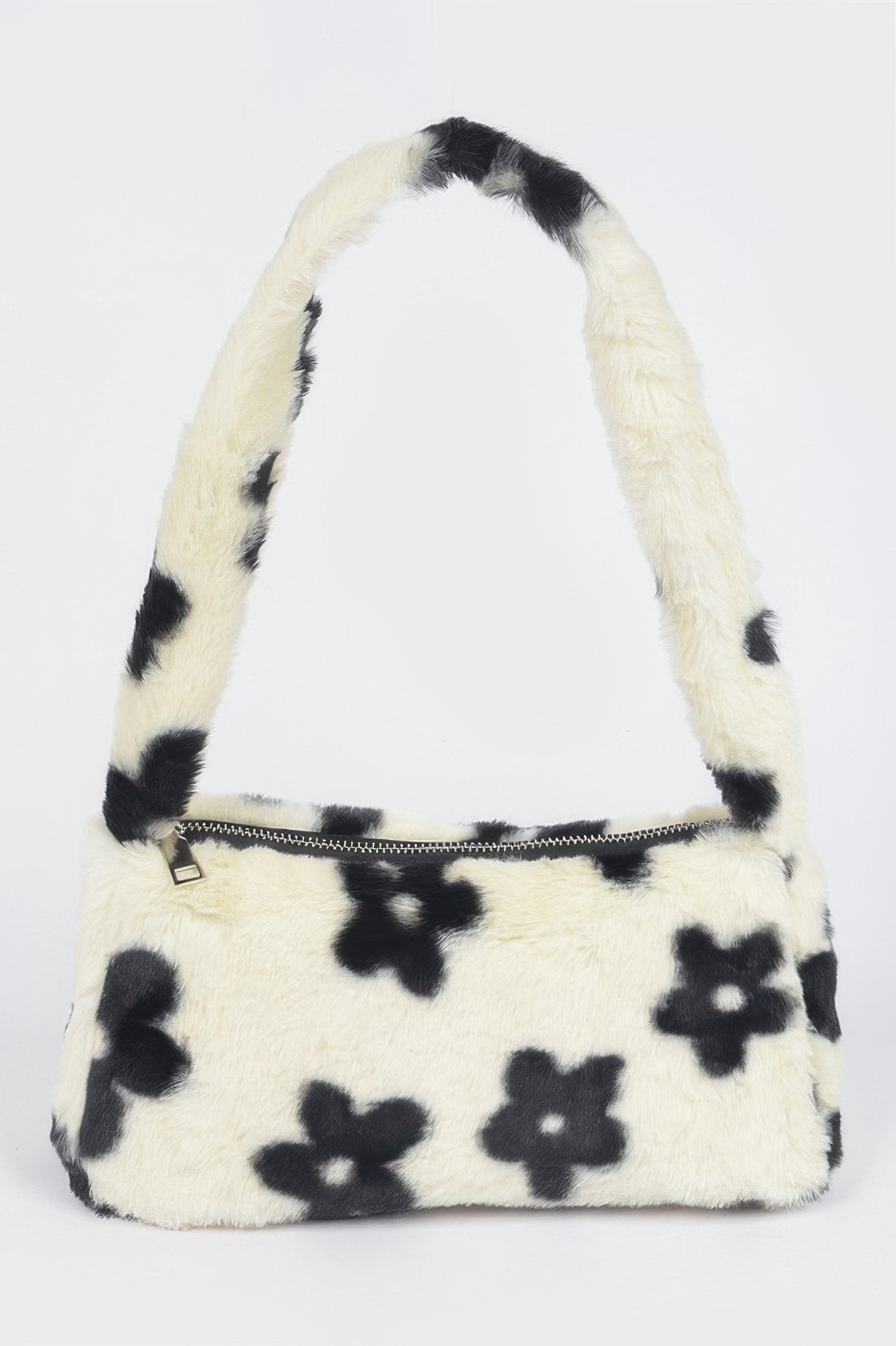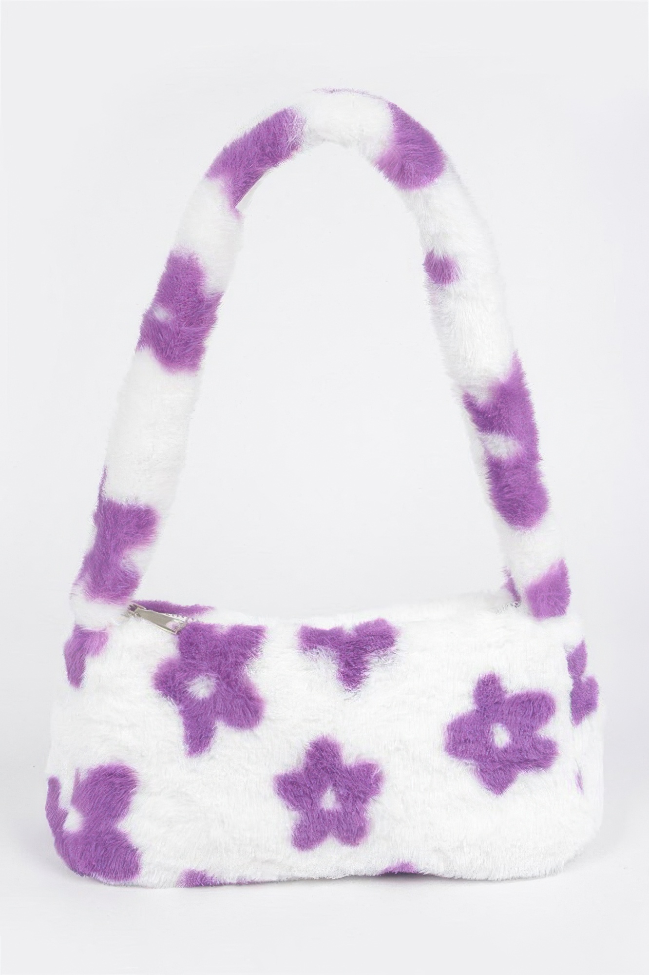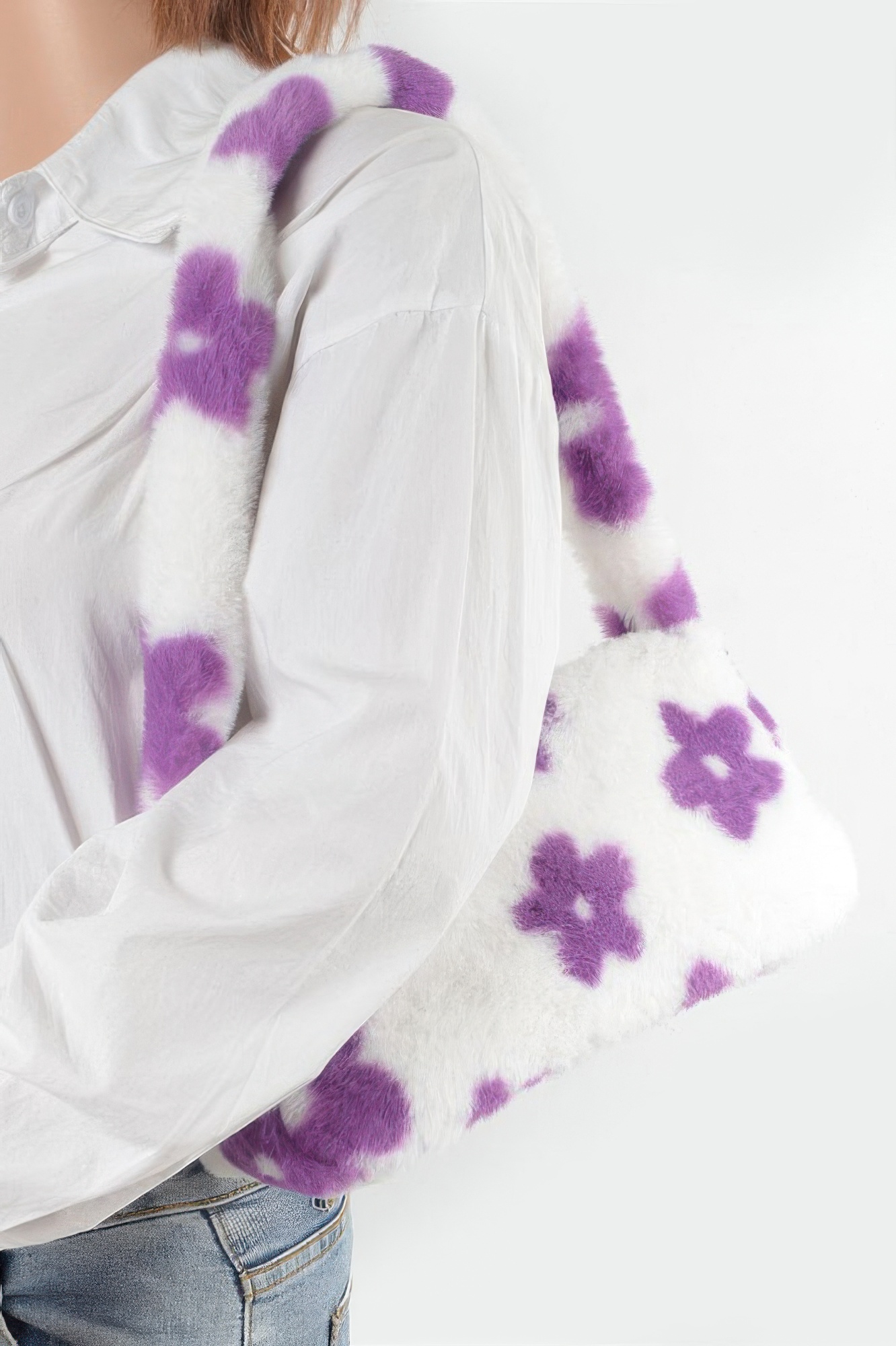 This faux wool flower print shoulder bag features a soft textured finish accented with a floral pattern for a charming and cozy look. The structured shape offers both style and practicality, while the printed design adds visual interest. Its compact size makes it suitable for everyday essentials. Designed for comfortable shoulder wear, it blends function with style. A distinctive accessory, it adds a warm and stylish touch to any outfit.