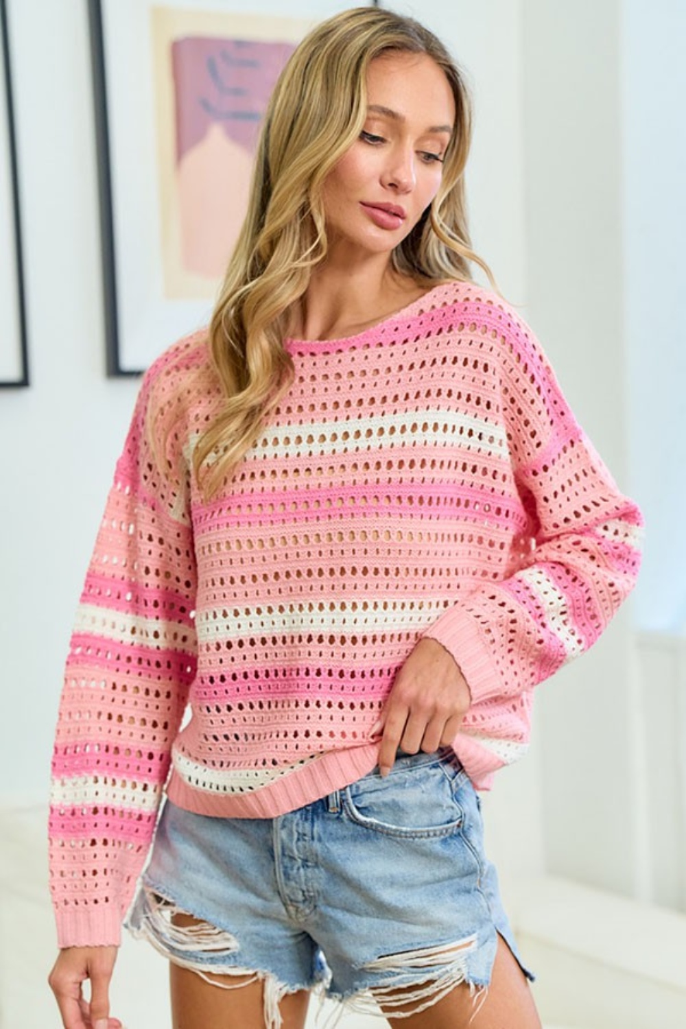 This Striped Long Sleeve Openwork Knit Top is a chic and versatile addition to your wardrobe. The striped design adds a classic touch while the openwork knit detail gives it a modern and stylish twist. With long sleeves, it's perfect for layering during cooler weather or wearing on its own in milder temperatures. The lightweight and breathable knit fabric ensures comfort and ease of movement. Pair it with jeans for a casual look or dress it up with a skirt for a more polished ensemble. Embrace effortless style with this fashionable and on-trend top!