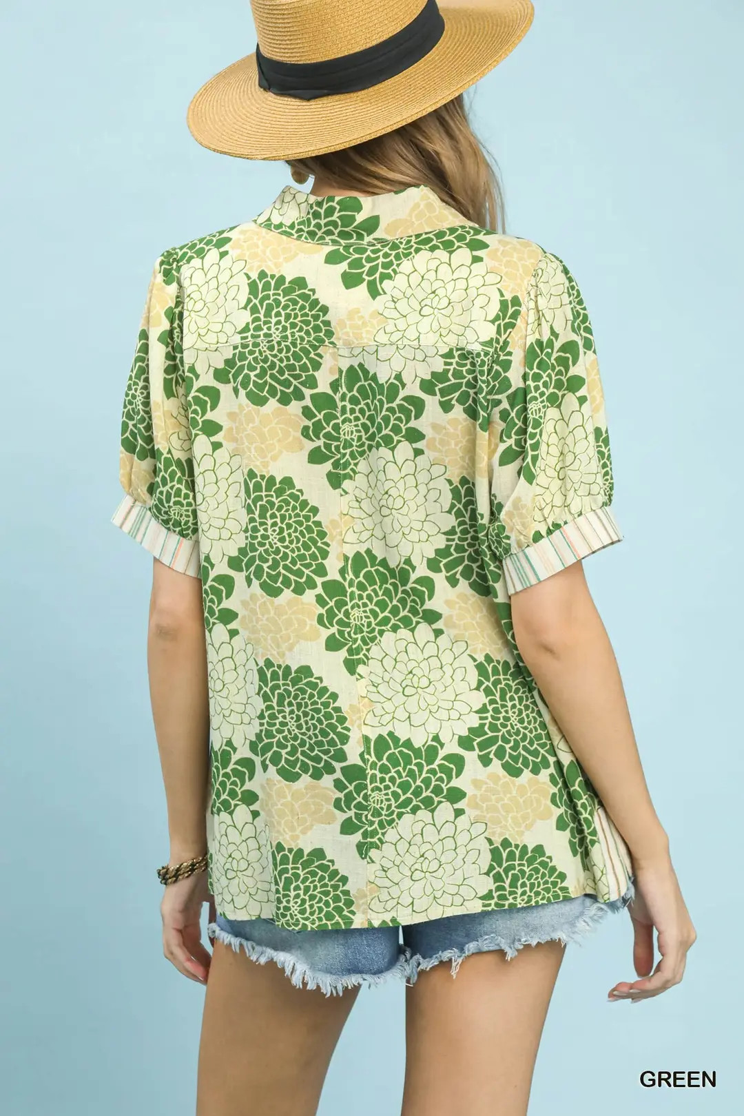 The Floral Collared Short Sleeve Blouse is a charming and versatile piece for your wardrobe. Made from linen, this blouse offers a lightweight and breathable feel. The floral print with multi-stripe contrast adds a cheerful and vibrant touch to the design. Featuring a collared V-placket, this blouse exudes a classic and polished look. The short sleeves with striped contrast cuffs provide a trendy and stylish detail. Perfect for adding a pop of color and femininity to your outfit, the Floral Collared Short Sleeve Blouse is a chic and playful top for various occasions.