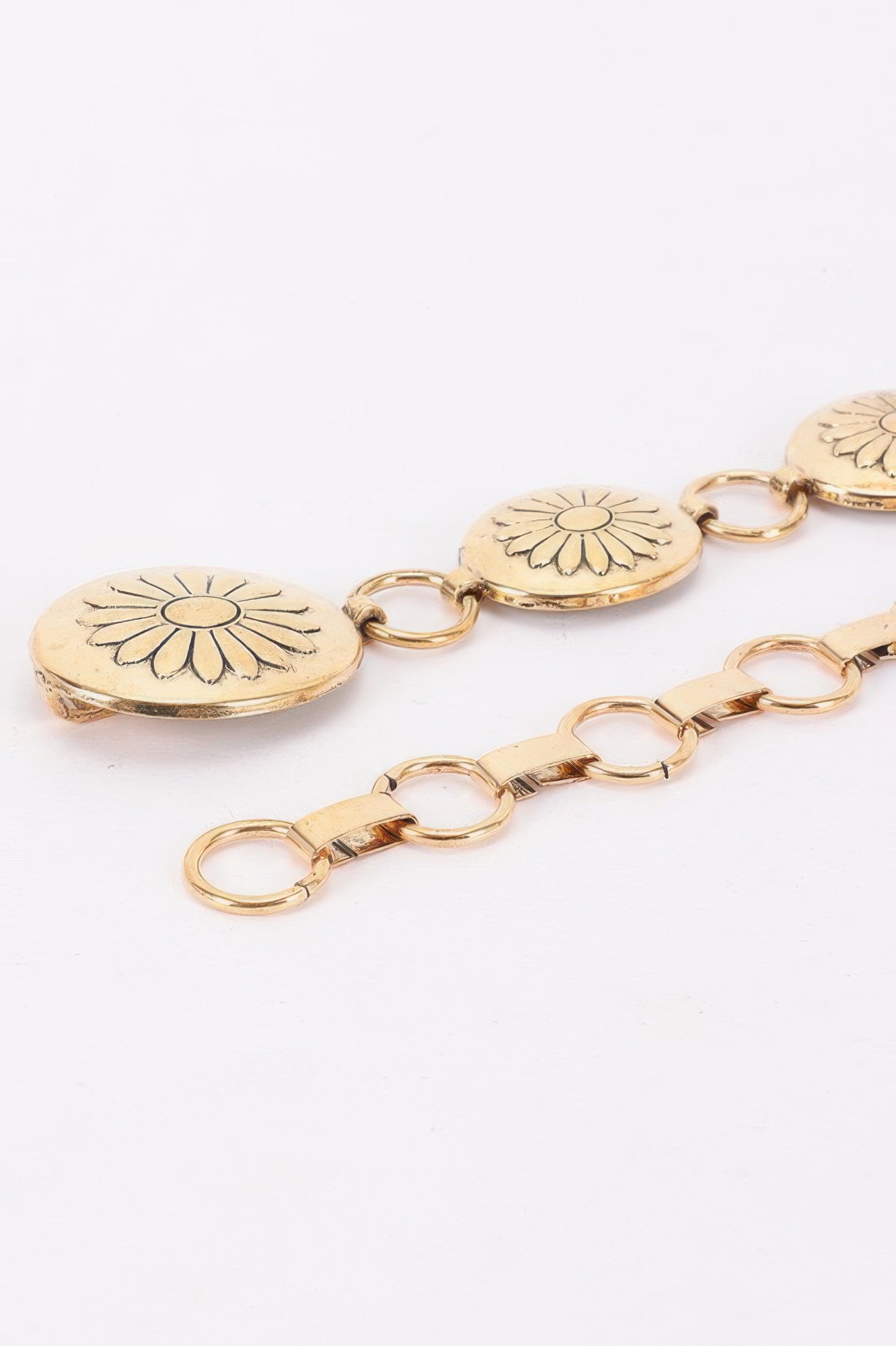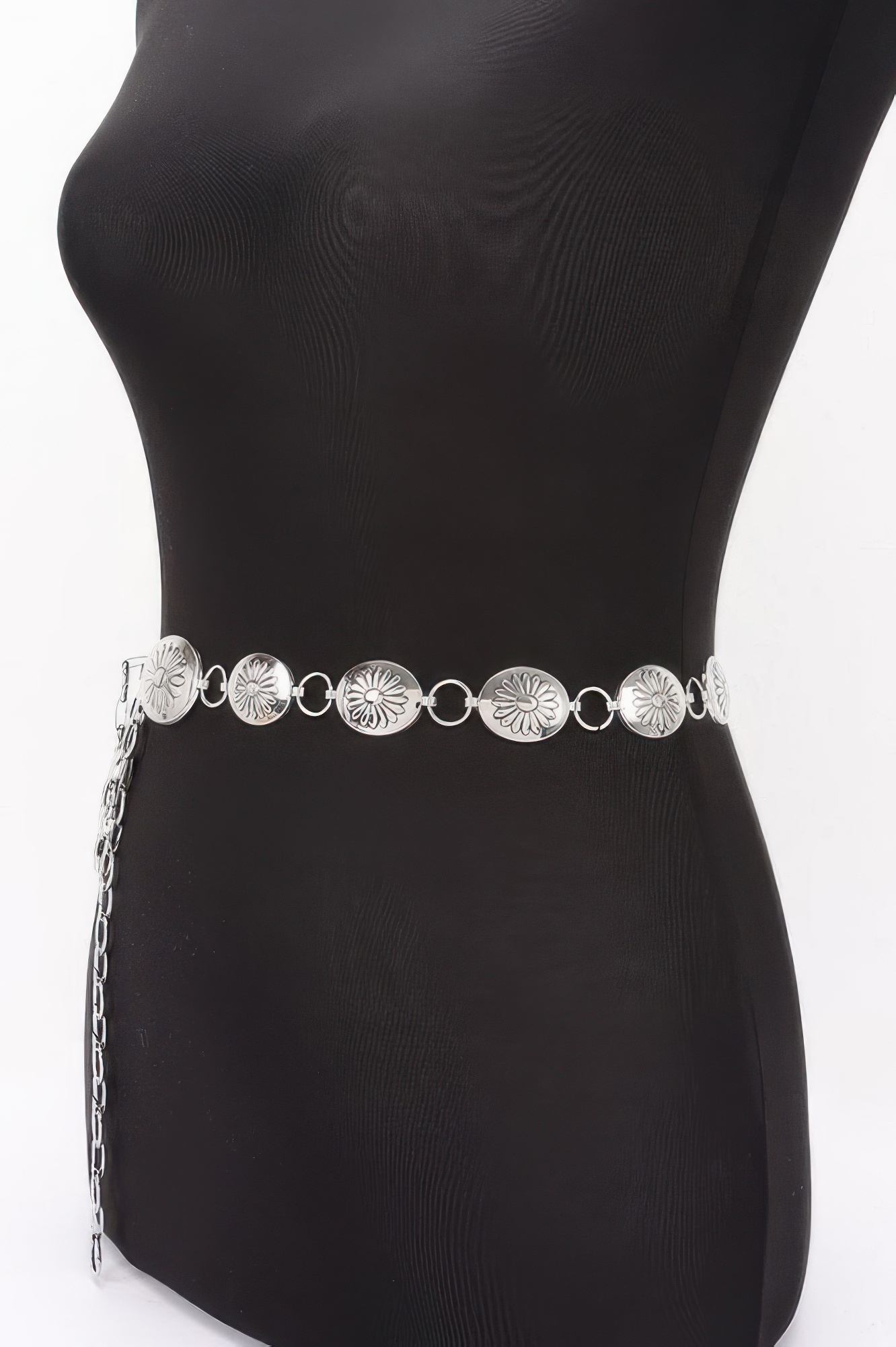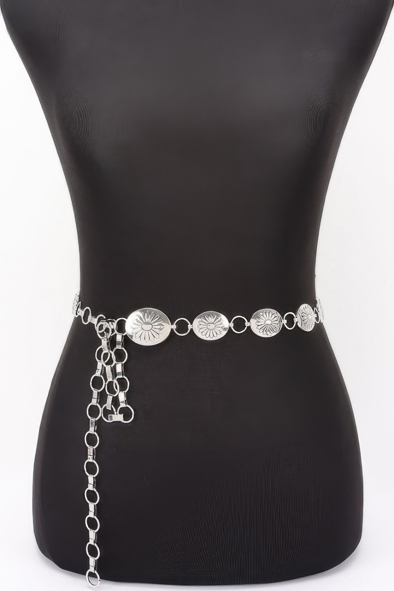 The Floral Disc Chain Belt adds a touch of bohemian artistry to your everyday wardrobe. Designed with ornate floral discs and a sleek chain structure, this belt brings creative flair to casual or festival-ready outfits. Style it with flowing skirts, maxi dresses, or high-waisted pants for a grounded, expressive look. It’s an easy way to elevate your ensemble with texture and charm.
