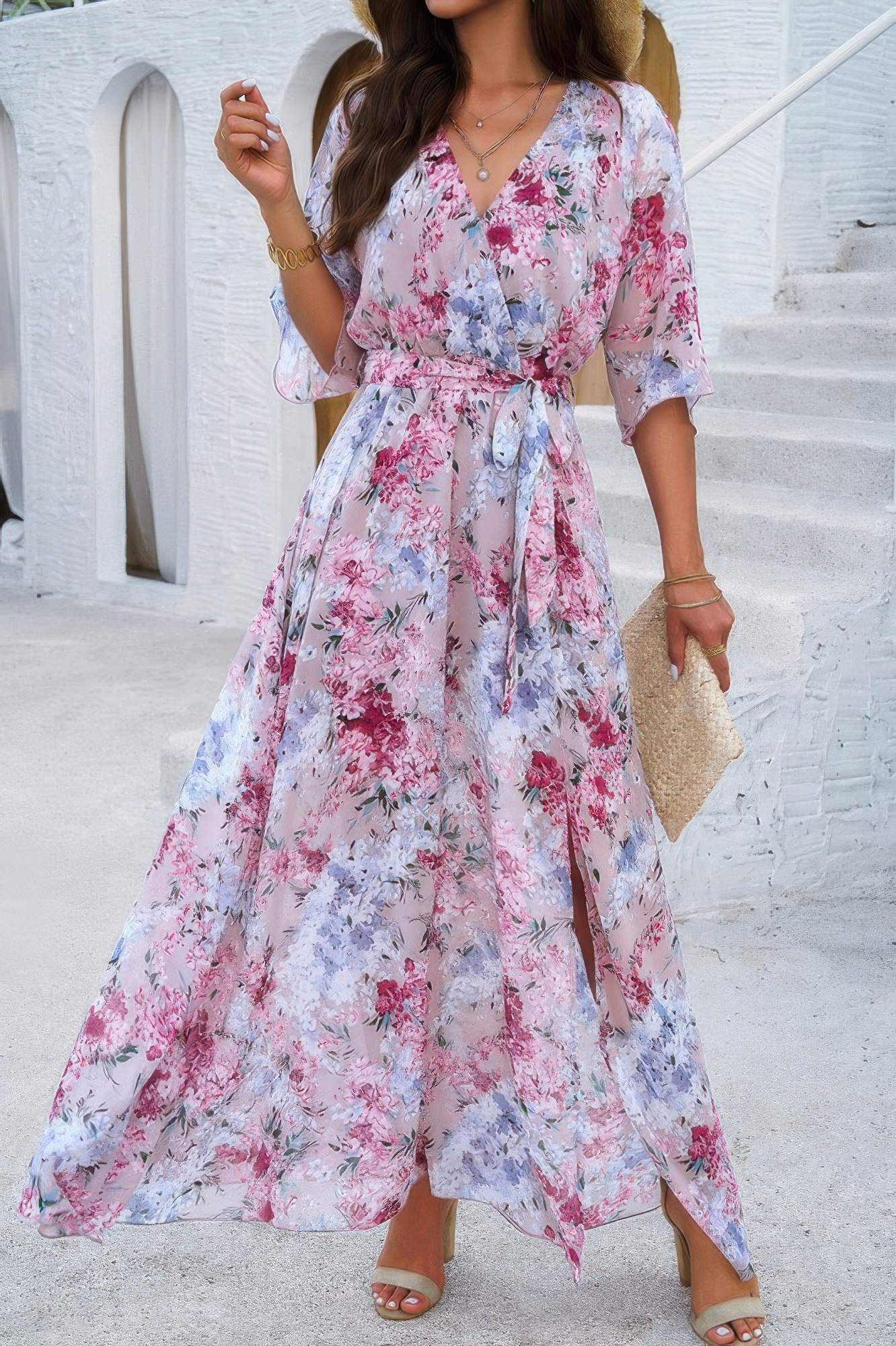 • Floral Print V Neck Waist Cinched Split Long Dress for added style and flair