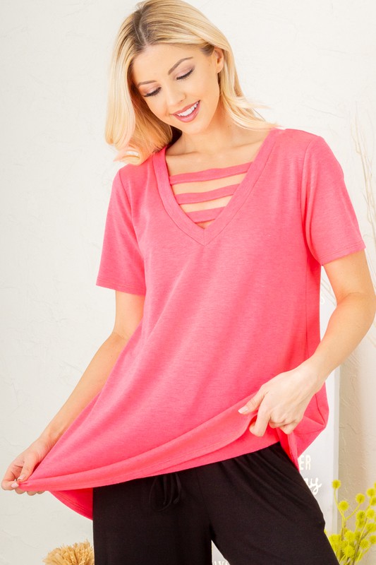 The V-Neck Short Sleeve T-Shirt with Bar Detail is a modern and stylish take on a classic wardrobe staple. The V-neck design adds a flattering touch, while the bar detail adds a unique and edgy element to the t-shirt. This versatile piece can be dressed up or down, making it perfect for various occasions. Pair it with jeans for a casual look or with a skirt and heels for a more elevated outfit. With its trendy design, this t-shirt is sure to add a fashionable flair to your everyday wardrobe.