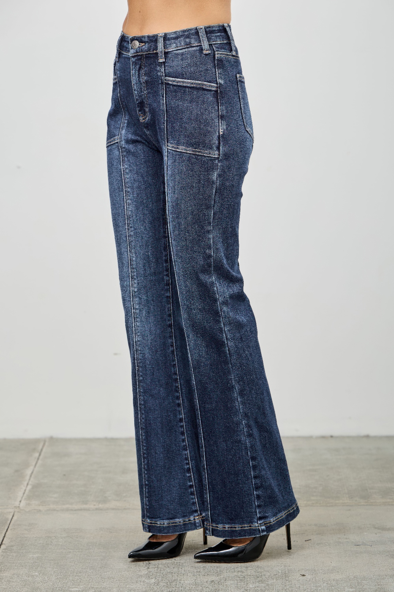 Timeless with a tailored twist, these high-rise bootcut jeans feature refined seam detailing for a structured, elongating effect. The high-rise waist enhances your shape, while the bootcut leg creates a flattering, balanced silhouette. Crafted from a soft stretch blend, they offer all-day comfort with lasting structure. Classic 5-pocket styling and a clean zipper fly complete the look, making them a versatile staple for both casual and elevated outfits. Pair them with boots or heels to highlight the lengthening effect.