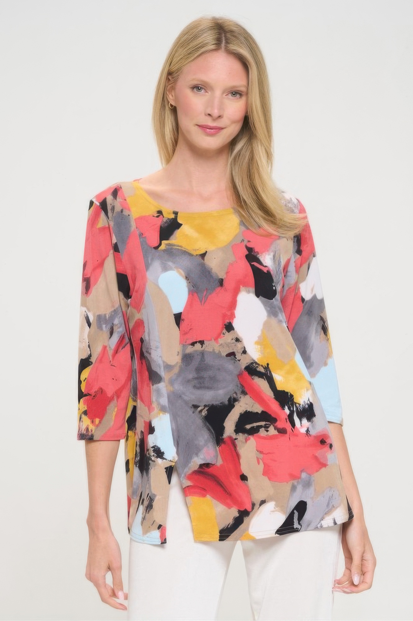Polish your wardrobe with the HIT 3/4 Sleeve Slit Top — a perfect piece for day-to-evening wear. Designed with a round neckline and subtle side slits, this top balances structure with comfort. The printed finish adds personality, while the soft, stretch fabric allows for easy movement. Ideal for work or weekends, it’s a versatile staple with timeless appeal.