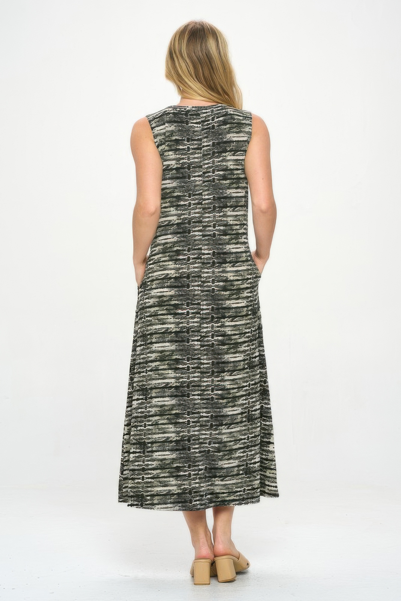 This sleeveless bias-cut dress is designed with both elegance and practicality in mind. Featuring a flattering V-neckline and a soft drape, it moves beautifully with every step. The side seam pockets add functionality, while the printed ITY fabric offers stretch and ease. Whether worn to a gathering or styled for everyday wear, it delivers comfort with a polished finish. Made in the USA with quality craftsmanship.