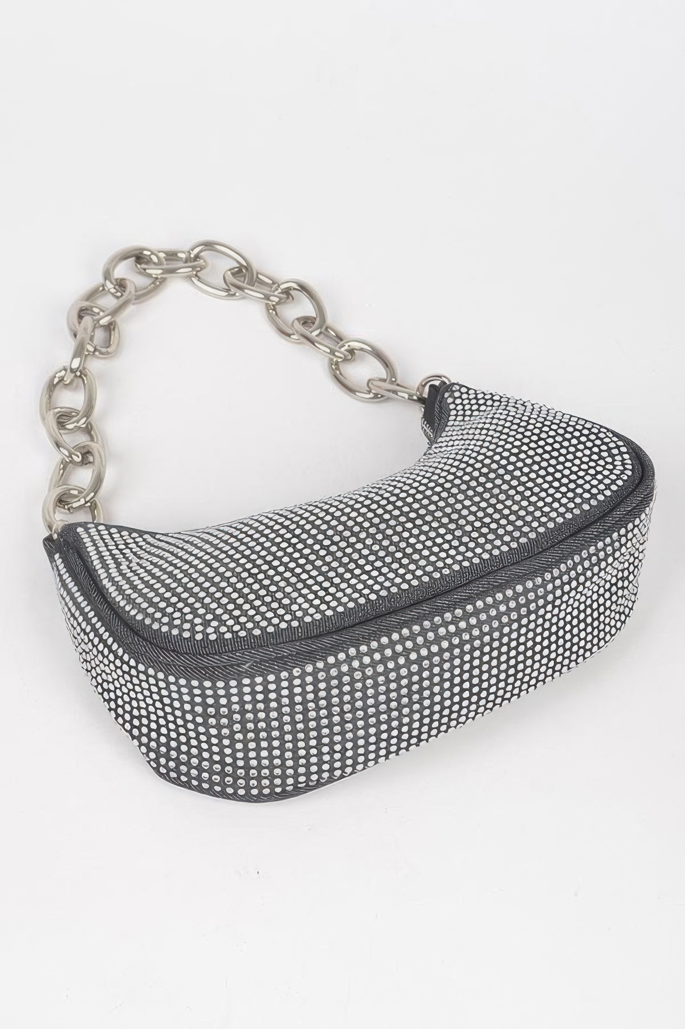 This hot fix stone small hobo bag blends compact design with bold embellishment. Featuring shimmering stones, it delivers eye-catching texture in a refined size. The hobo silhouette keeps the look relaxed yet polished. A chain strap adds a modern, elevated touch. Designed for essentials, it offers practical everyday functionality. Lightweight materials ensure comfortable wear. This bag is a versatile statement piece with standout appeal.