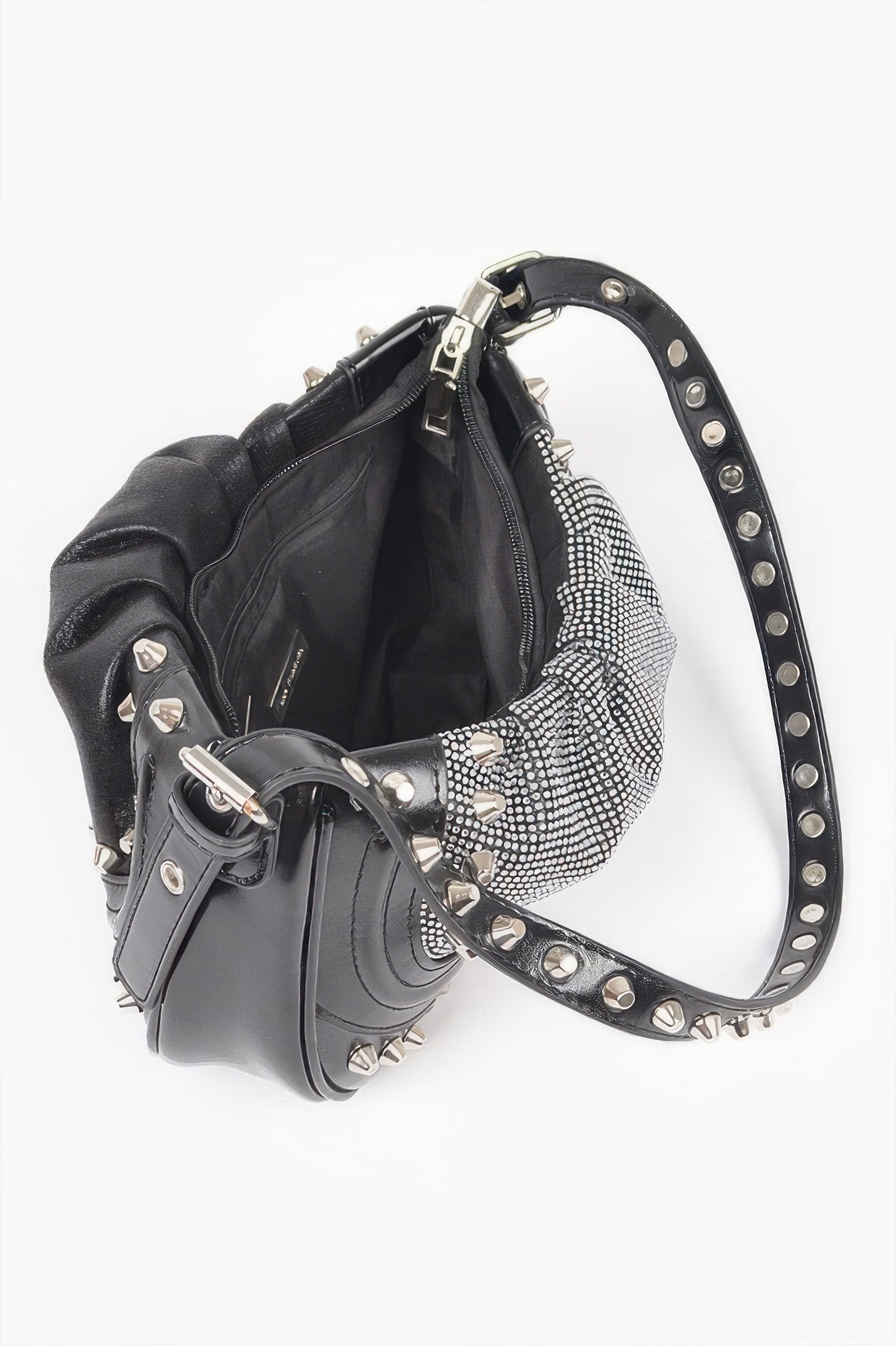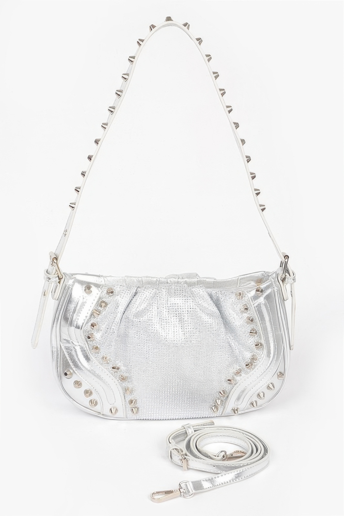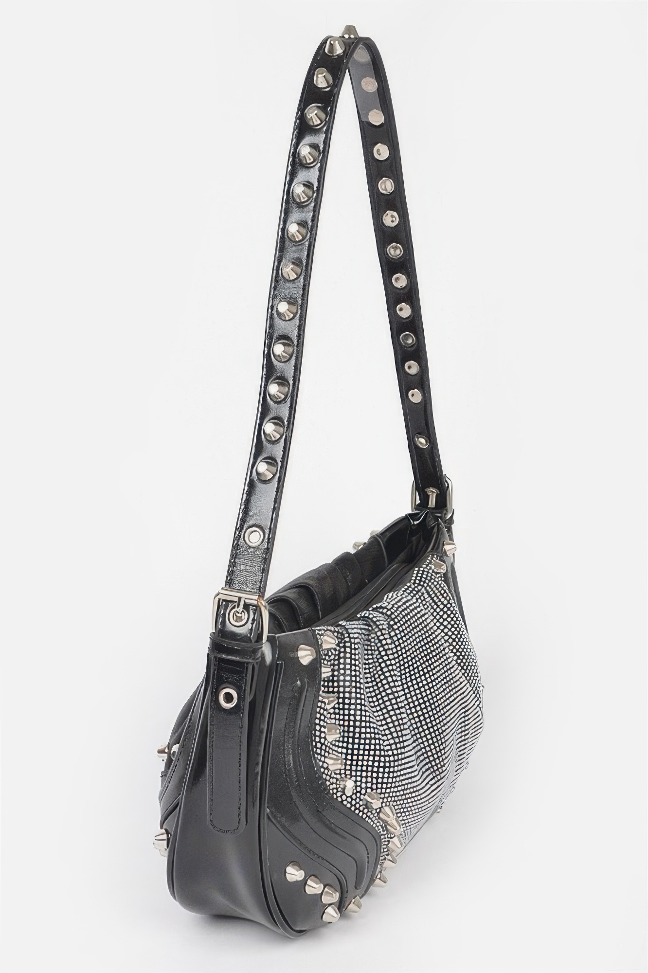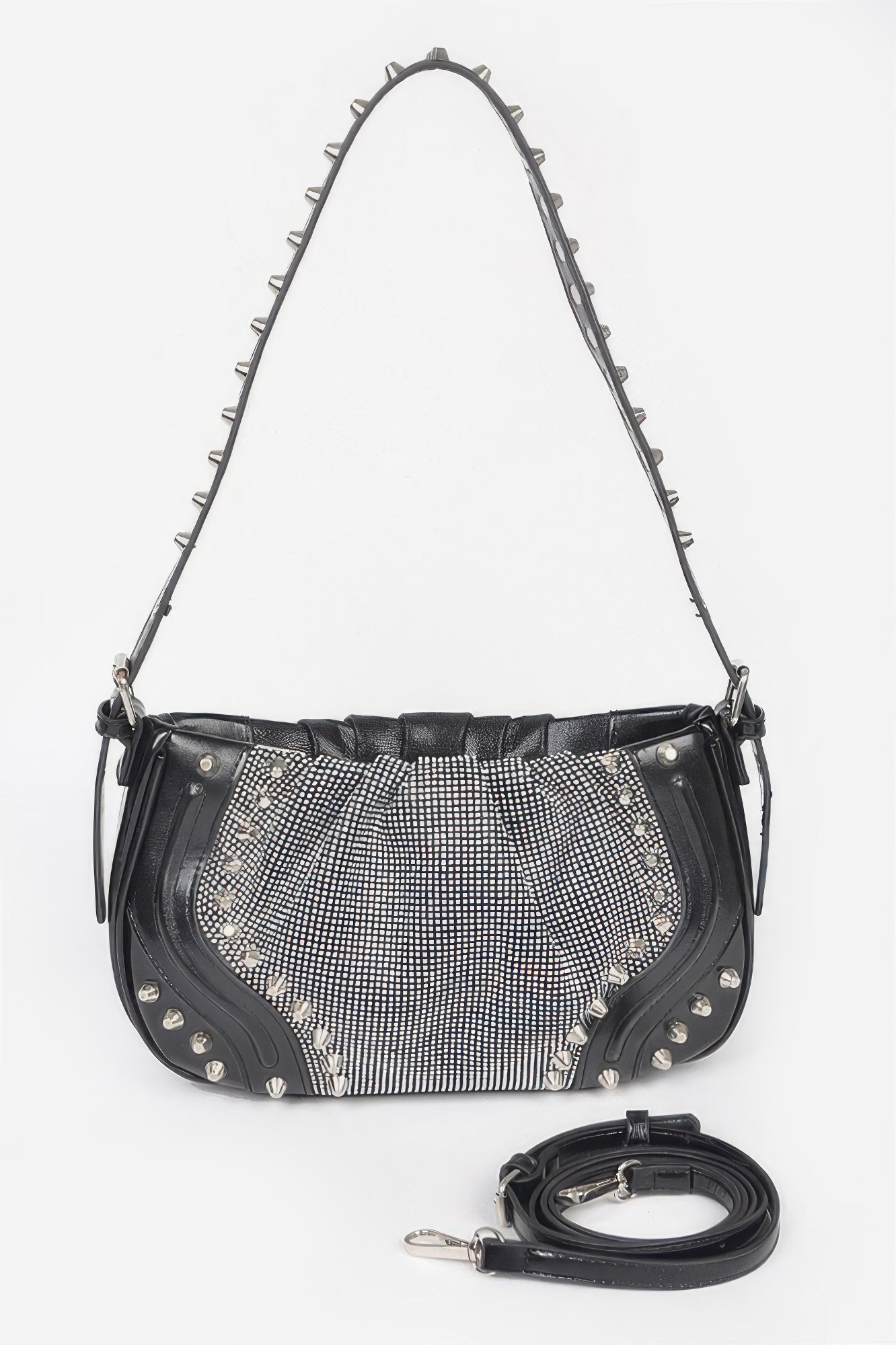 Hot Fix Stones Metal Stud Shoulder Bag delivers standout style with its compact silhouette and eye-catching finish. Designed to shimmer, this bag adds a glam touch to your evening or party look. Crafted from Polyurethane, Mixed Metal, the design ensures durability with a luxe finish. Measuring approximately 11.5 x 6 x 3 inches, it's perfectly sized for easy wear. Compact yet impactful, it's ideal for when you want to carry just the essentials in style. Pair it with anything from jeans to dresses to elevate your overall look.