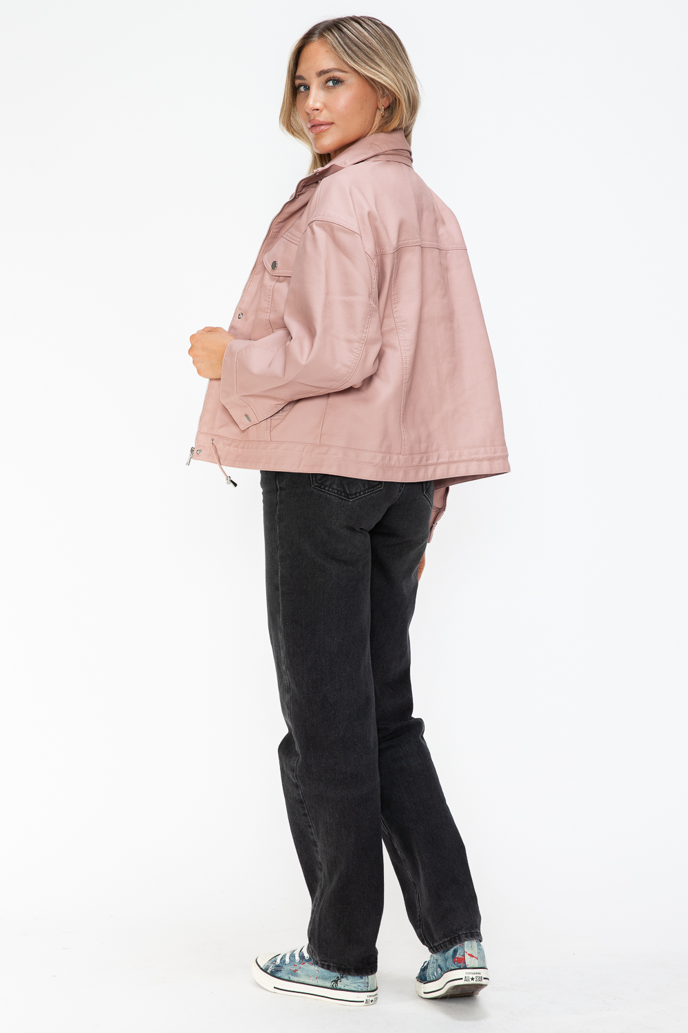 The Drawstring Hem PU Leather Zip Up Jacket is a trendy and edgy addition to your wardrobe. Made from high-quality PU leather, this jacket features a stylish drawstring hem that allows you to adjust the fit to your preference. The zip-up front adds a modern touch, making this jacket a versatile option for a variety of outfits. Stay on-trend and sleek with this must-have piece for your collection.