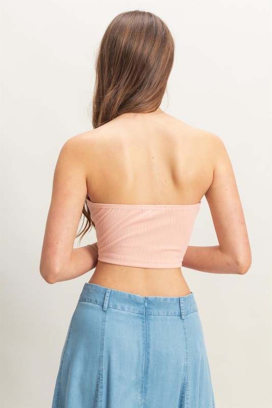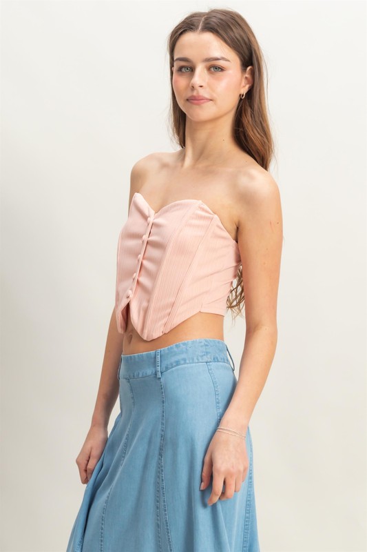 The buttoned front strapless knit bustier top is a trendy and chic piece that adds a touch of sophistication to any outfit. The button detailing on the front adds a stylish accent, while the strapless design offers a modern and sleek look. This top is perfect for creating a fashionable and elegant ensemble for a night out or a special occasion.