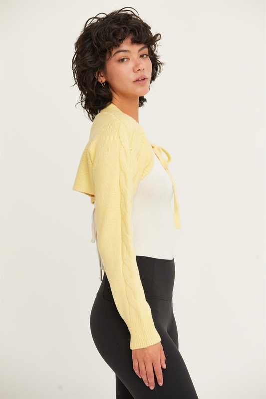 The Cable-Knit Tie-Front Shrug is a fashionable and versatile piece that features a cozy cable-knit design and a trendy tie-front closure. This shrug adds a stylish layer to your outfit, perfect for pairing with tops or dresses to create a fashionable look. The Cable-Knit Tie-Front Shrug is a chic and functional addition to any wardrobe.