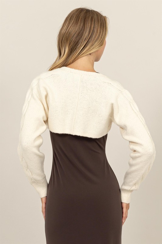 The Cable-Knit Tie-Front Shrug is a fashionable and versatile piece that features a cozy cable-knit design and a trendy tie-front closure. This shrug adds a stylish layer to your outfit, perfect for pairing with tops or dresses to create a fashionable look. The Cable-Knit Tie-Front Shrug is a chic and functional addition to any wardrobe.