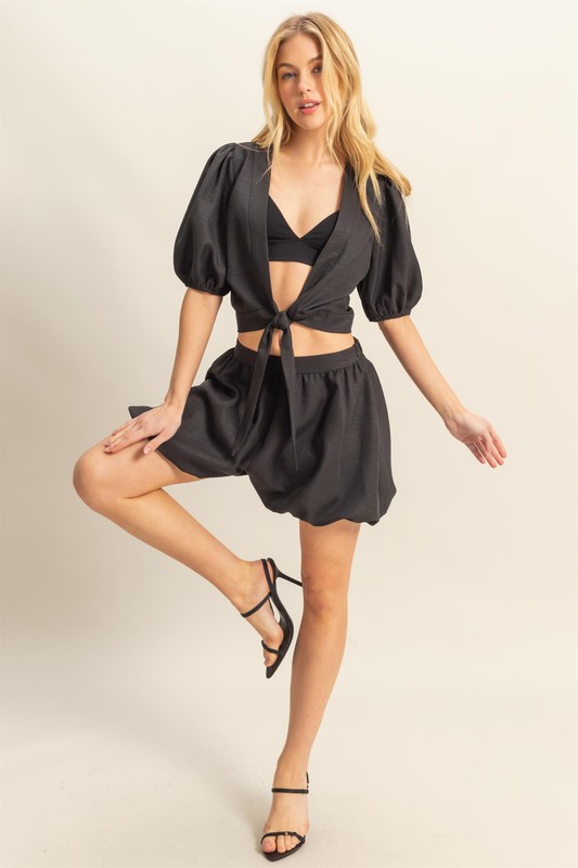 The Front Tie Top and Bubble Hem Shorts set is a cute and trendy outfit for the summer. The front tie detail adds a touch of femininity and style to the top. The bubble hem shorts are fun and playful, perfect for a sunny day out. This set is easy to wear and can be dressed up or down with the right accessories. Wear it with sandals for a casual daytime look or dress it up with heels for a night out.