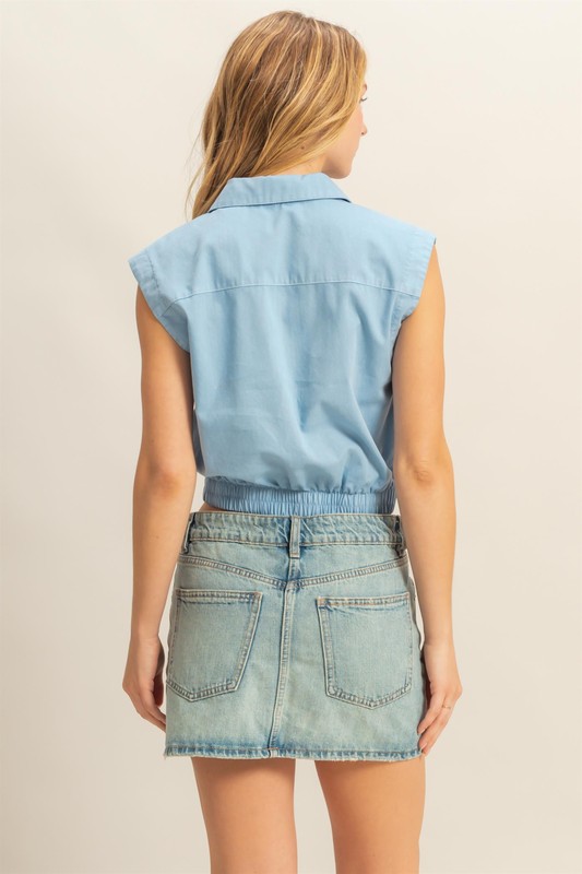 The Johnny Collar Sleeveless Cropped Blouse is a stylish and trendy top that features a unique collar design. This blouse is sleeveless, making it perfect for warm weather or layering with other pieces. The cropped length adds a modern and chic touch to any outfit.