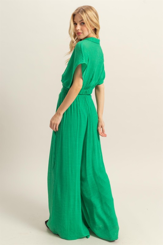 This Kimono Sleeve Crop Top and Wide Leg Pants Set is a stylish and modern outfit choice. The kimono sleeves on the crop top add a touch of elegance and flowy movement. Paired with the wide-leg pants, this set offers a trendy and chic silhouette that is perfect for various occasions. The combination of the kimono sleeves and wide-leg pants creates a fashionable and comfortable ensemble that can be easily dressed up or down.