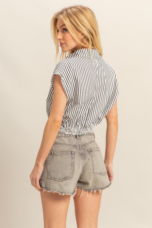 Elevate your casual style with the Striped Elastic Hem Johnny Collar Cap Sleeve Blouse. This blouse features a unique Johnny collar and chic cap sleeves, adding a touch of sophistication to the classic striped design. The elastic hem provides a comfortable and flattering fit, perfect for all-day wear. Pair this blouse with your favorite jeans or trousers for a polished yet relaxed look that is perfect for both work and leisure.