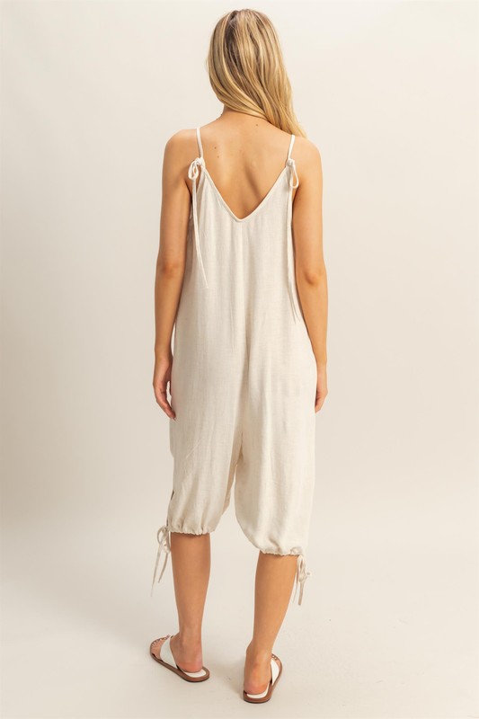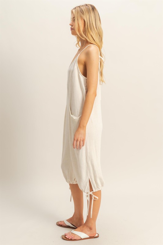 Step out in style with this V-Neck Romper featuring Pocket Details and a Side Tie Hem. The V-neckline adds a touch of femininity, while the side tie hem creates a flattering silhouette. The convenient pockets offer both functionality and style to this chic romper. Perfect for a casual day out or a beach trip, this romper is a versatile piece that can be dressed up or down. Embrace comfort and fashion with this must-have addition to your summer wardrobe.