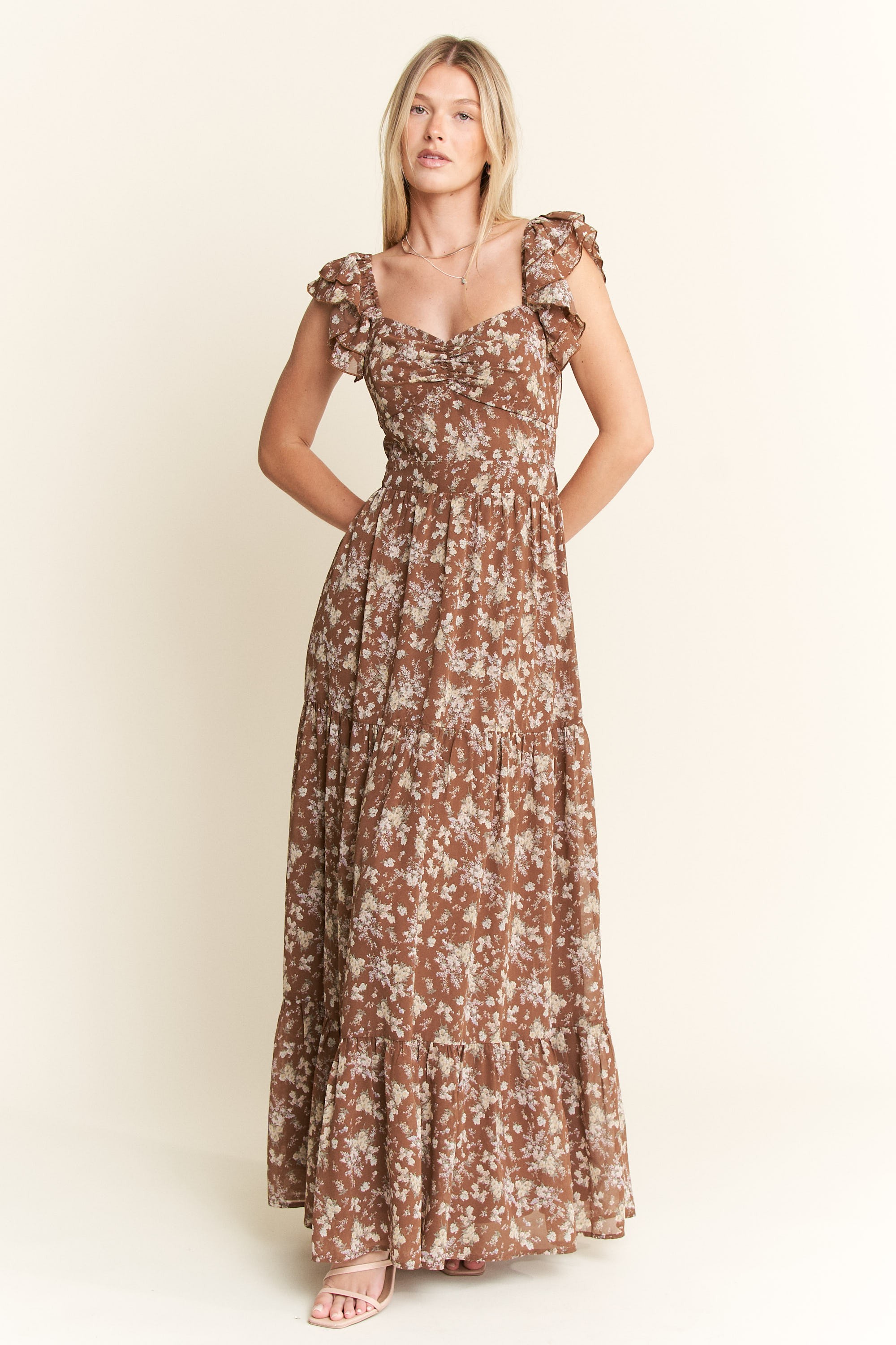 This enchanting maxi dress features a vintage-inspired floral print in warm brown tones on a light background. Made from lightweight, breathable fabric, the dress showcases romantic design elements including ruffle cap sleeves, a sweetheart neckline, and a tiered maxi skirt. The empire waist creates a flattering silhouette while the flowing A-line cut provides comfortable movement. Perfect for garden parties, weddings, or summer events, this dress combines bohemian charm with feminine elegance. The fabric appears to be a soft, airy material suitable for warm weather wear.