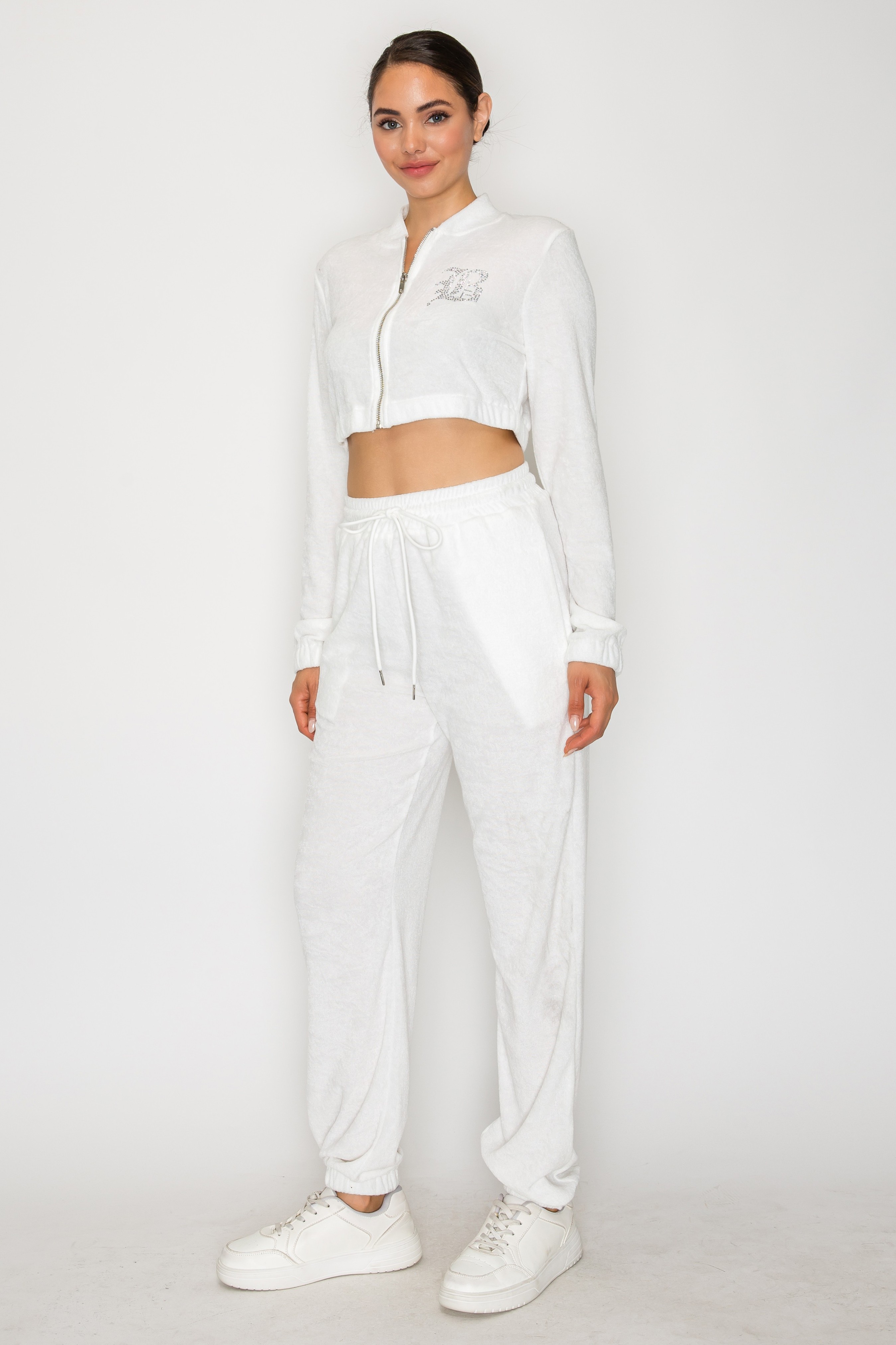 Two-piece set includes cropped terry cloth jacket and jogger pants