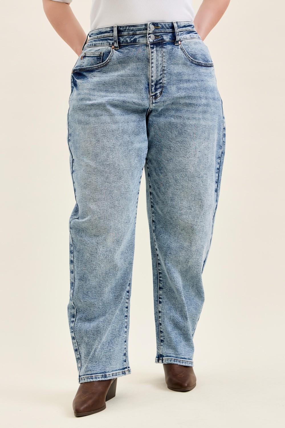 These High Waist Marlow Arc Leg Jeans feature a modern high-rise fit with a unique curved arc leg silhouette that flatters every body shape. Designed with a trendy double waistband, they add subtle structural detail and a fashion-forward touch to your denim collection. Crafted from comfortable stretch denim, they offer all-day flexibility while maintaining a sleek, tailored look. The durable construction and classic wash make them versatile for casual daily wear, easy to pair with any top for a polished yet relaxed outfit. With their distinctive leg shape and elevated waist design, they blend comfort, style, and on-trend appeal seamlessly.