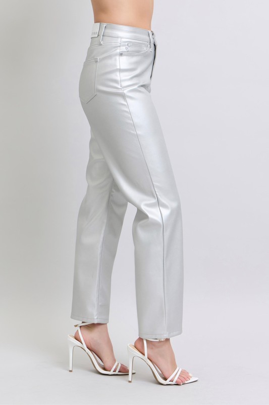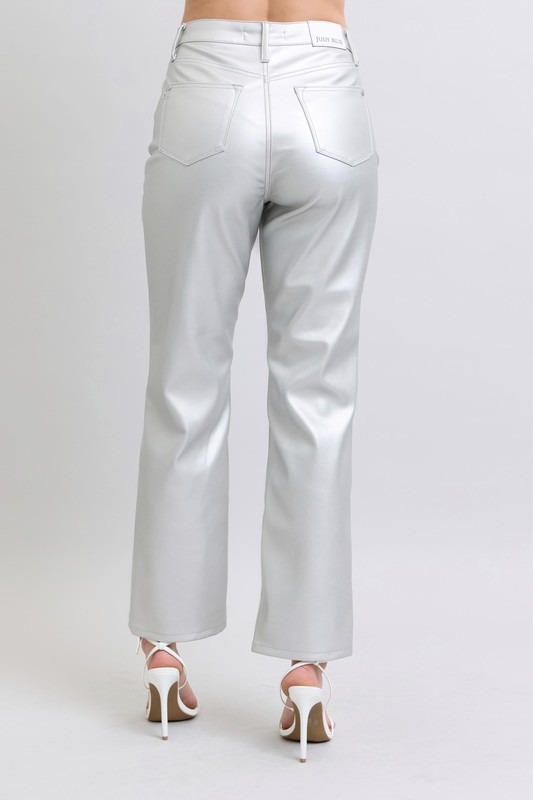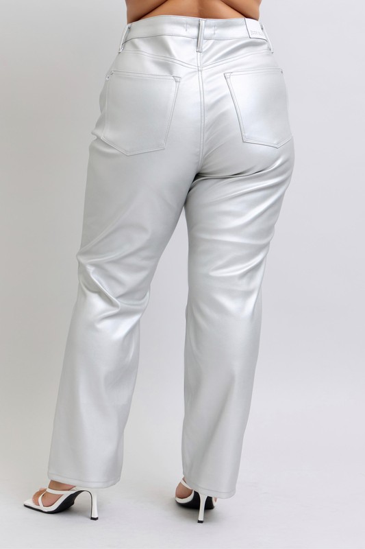 The High Waist Silver Faux Leather Pants are a bold and fashionable choice for adding a statement piece to your wardrobe. The "high waist" design offers a flattering and elongating effect on the waistline, creating a sleek and stylish look. The "faux leather" material gives the pants a trendy and edgy vibe, offering the appearance of real leather without the use of animal products. The silver color adds a metallic and eye-catching element to the pants, perfect for creating a standout look for parties, events, or a night out. These pants can be styled in various ways, from pairing them with a casual tee and sneakers for a street-style look to dressing them up with a blouse and heels for a more formal ensemble. The combination of high waist, faux leather material, and silver color makes these pants a modern and versatile addition to your wardrobe for adding a touch of glamour and sophistication.