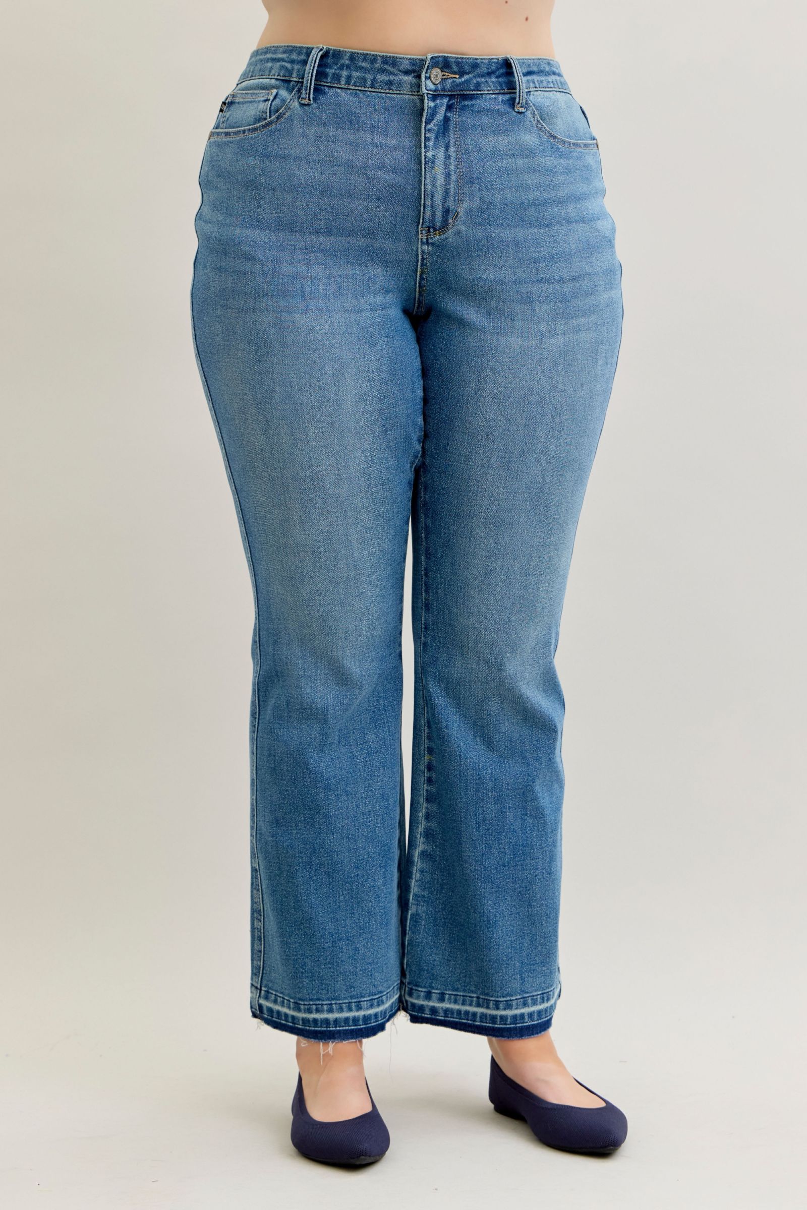 These mid-rise slim bootcut jeans offer tummy control for a flattering fit. The release hem adds a trendy touch to your look. This style is versatile and can be dressed up or down. Enjoy the comfort and style these jeans provide. Upgrade your wardrobe with this modern and chic piece.